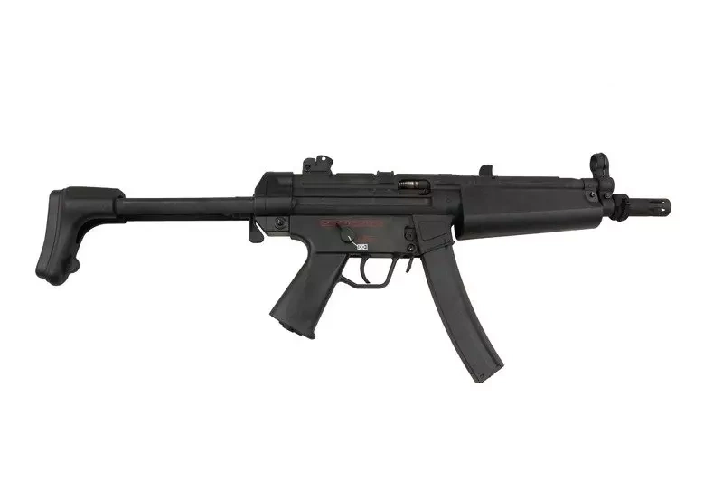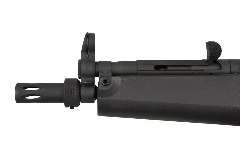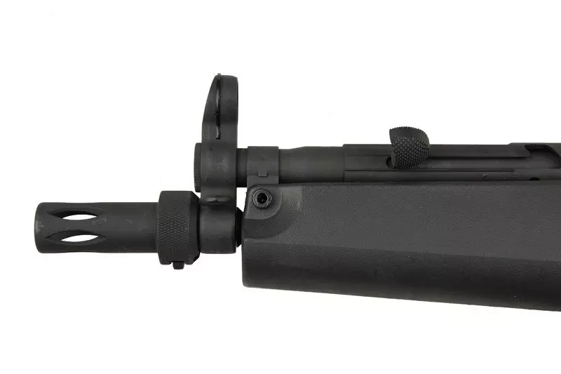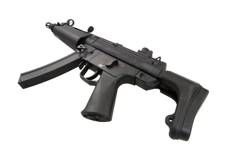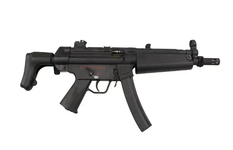 Replica made of metal and plastics. Barrel and body are made of metal. Front grip and pistol grip are made of plastics.