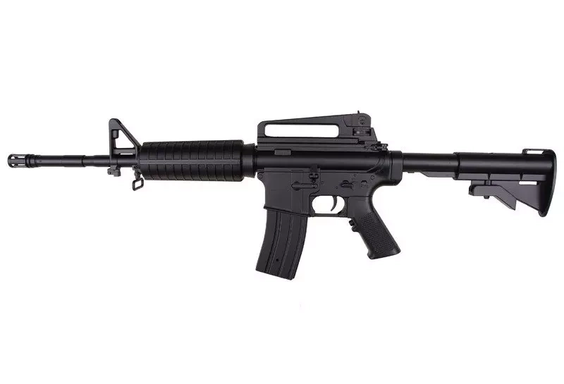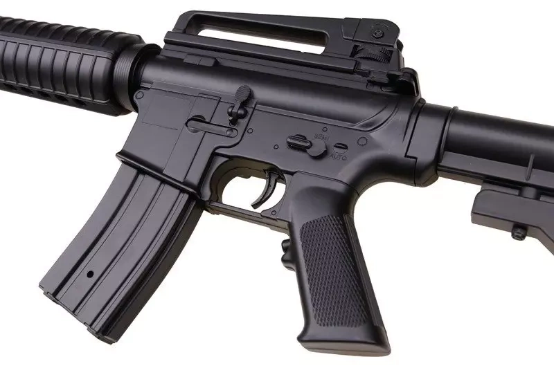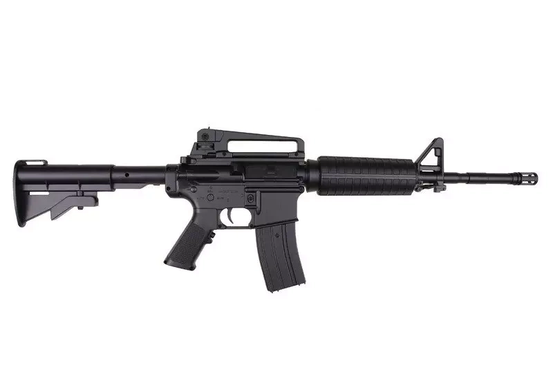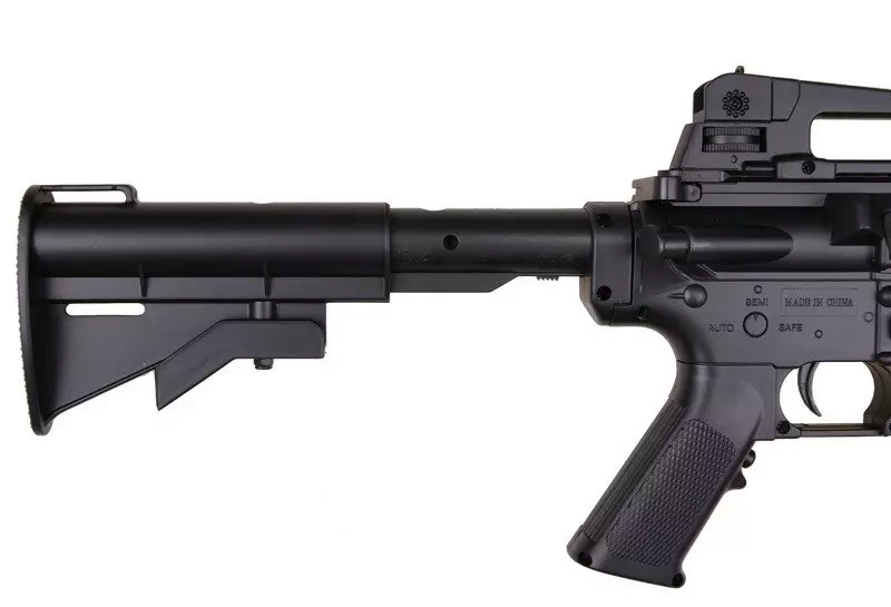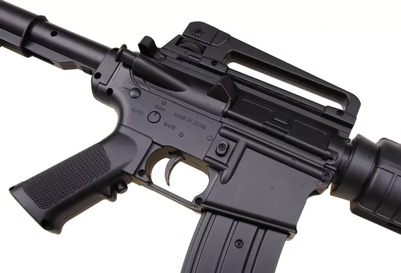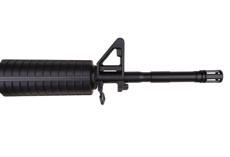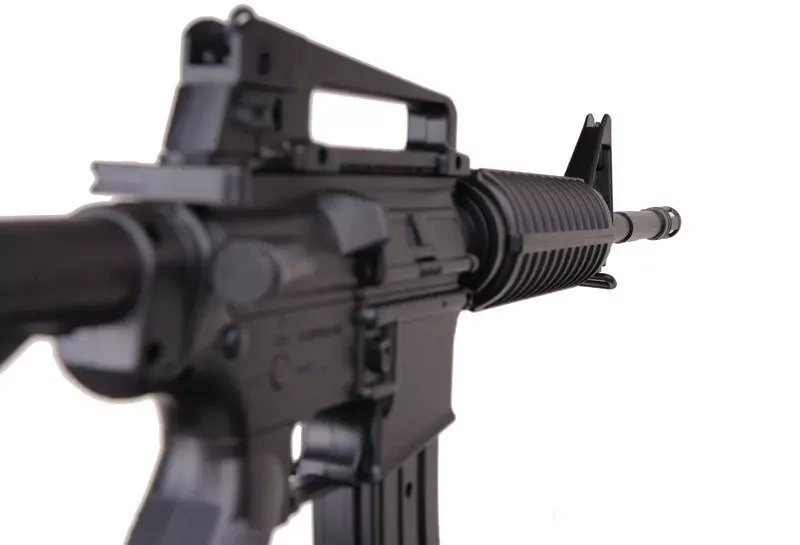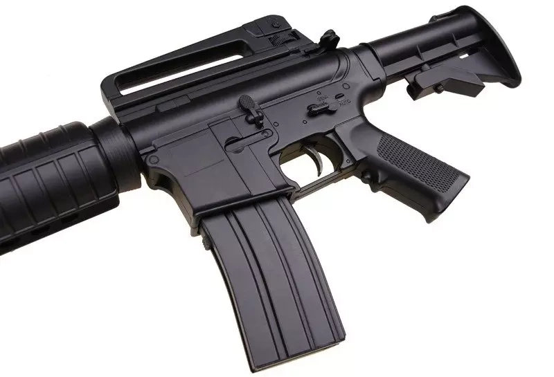 The replica of 4 A1 assault rifle was made of very durable durable plastic and metal elements placed in critical areas. It is characterized by good quality of workmanship and attention to detail such as adjustable sight in the transport handle. The transport handle is removable and allows the installation of additional accessories.