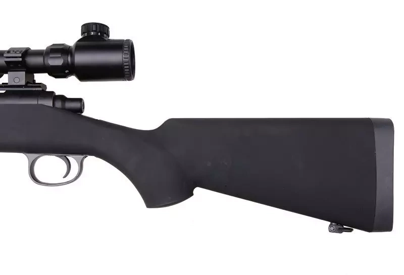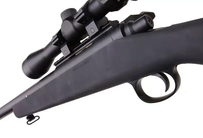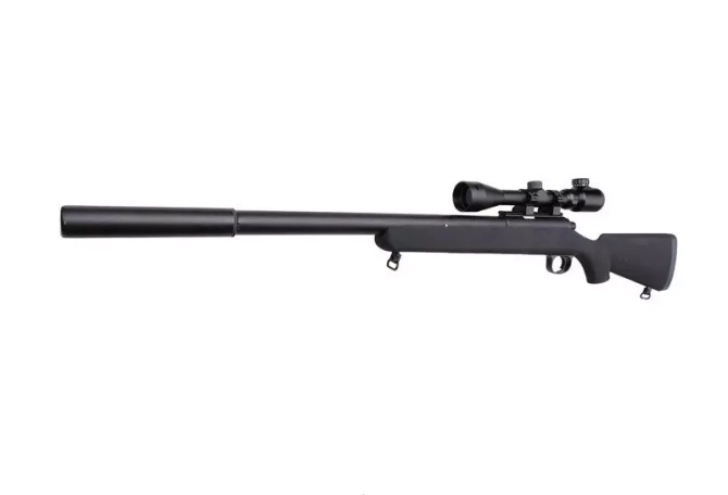A replica of a sniper rifle made of metal and high quality plastics. The bed and buttstock of the gun were made of plastic, as well as the magazine. The barrel, trigger assembly and cocking handle were made of metal.
