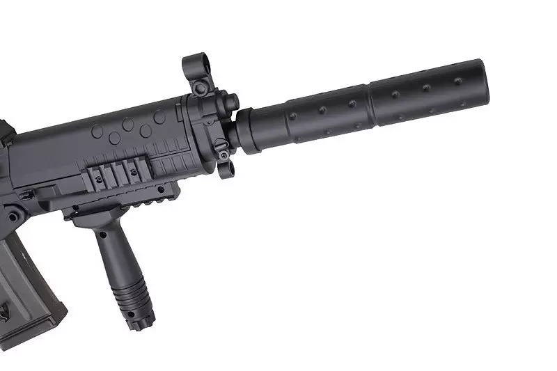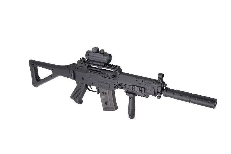 The replica set includes accessories such as a red dot sight or a tactical grip - which are mounted on a 22mm RIS rail. The replica set also includes a carrying sling and a battery with the charger and protective glasses.