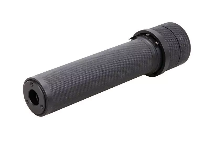 The sound suppressor with the PRO type silencing ( a chamber silencing system – the chambers are divided with plastic dividers), is designed for the AK and the AKM type replicas. It is equipped with an inner counter-clockwise 14mm thread. The sound suppressor was made with the use of the CNC technology, the aluminum which was used to make it was anodized thanks to what a proper anti-corrosive layer was created and it secures the sound suppressor from corrosion and adverse conditions.