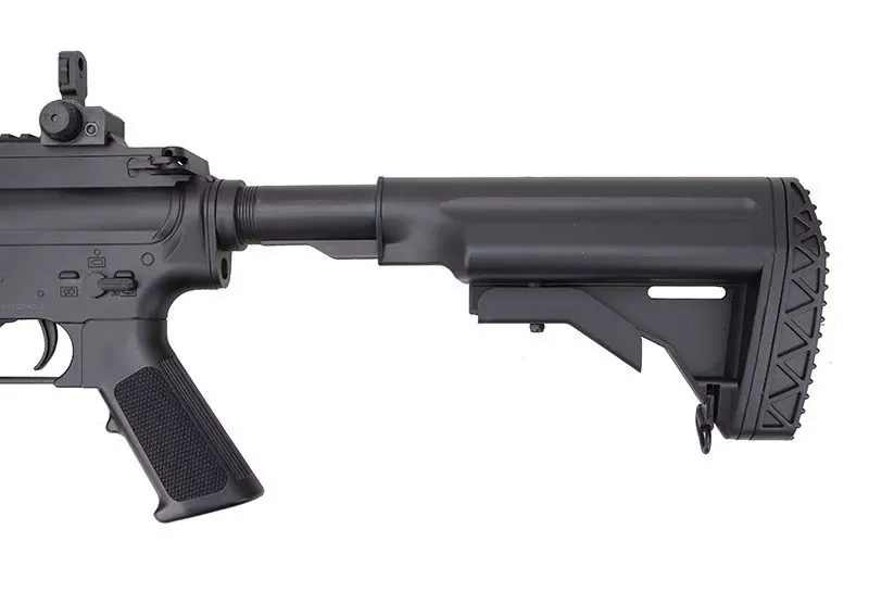 The body of the replica is pleasant to the touch and resistant to damage, while its proper balance in combination with low overall weight significantly improves the manoeuvrability of the replica, further increased by the use of a folding stock. The front grip is fully orisable, allowing the use of additional accessories. In addition, the replica is equipped with mechanical sights. The replica is powered by a gearbox made of polymer, generating a discharge velocity of ~200 FPS.