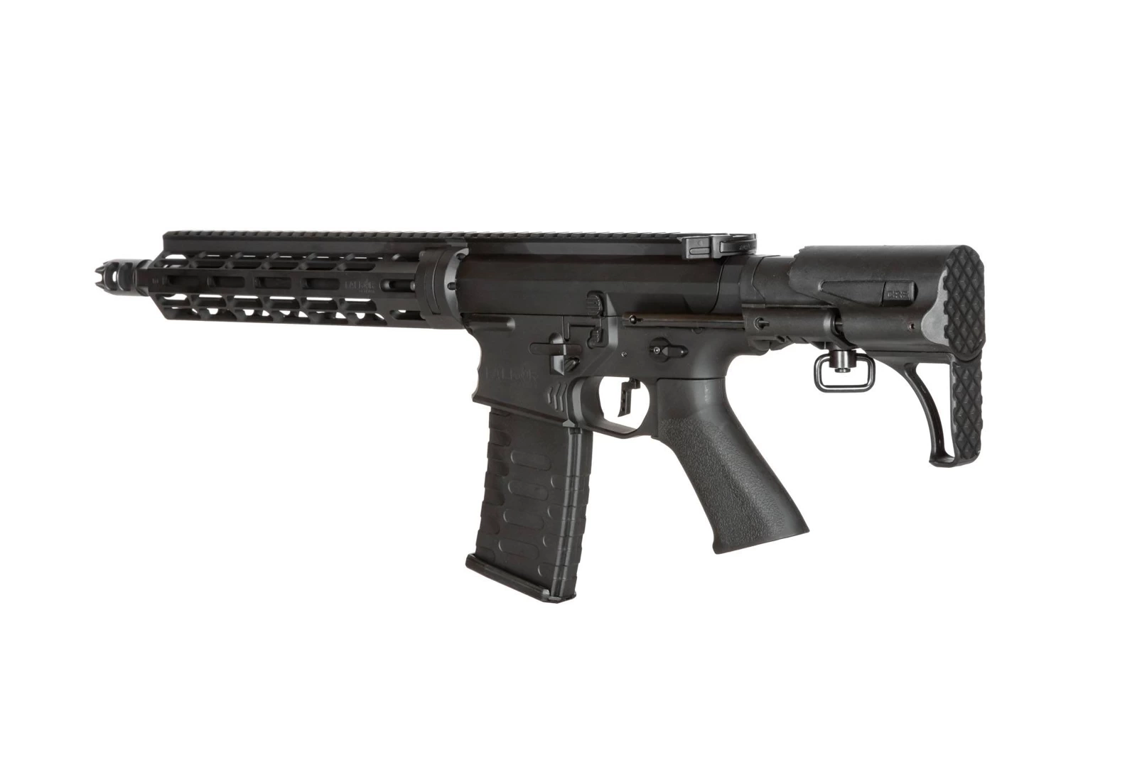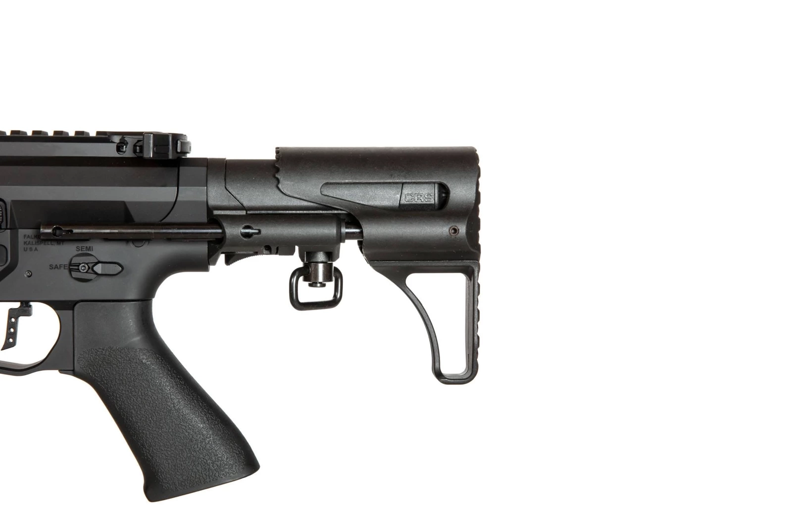 The replica was made mostly out of high-quality aluminum alloy - the receiver, outer barrel, stock guide, etc. Only the stock and the pistol grip were made out of strong plastic. The replica is equipped with a telescopic CRS stock with an adjustable length, inside which there can be housed a battery with dimensions of 117 x 32 x 31 mm.  The swing swivels for mounting the QD type tactical slings are located on the bottom of the stock.