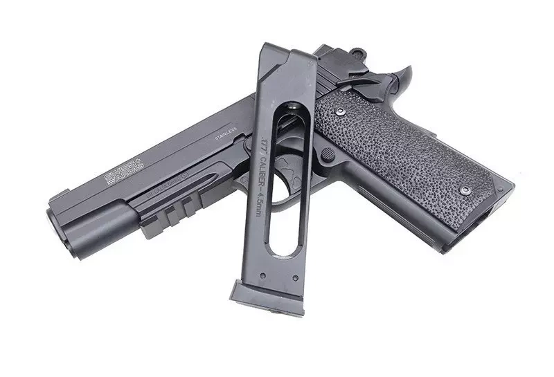 A heavy replica of military Colt 1911 made entirely from metal - with the exception of the skeleton made from durable polymer. The pistol fires 4,5 mm BBs.  Powered by 12 g CO2 capsule placed inside an 18 BB magazine. The replica features original Swiss Arms markings on the receiver, a Swiss company manufacturing firearms.