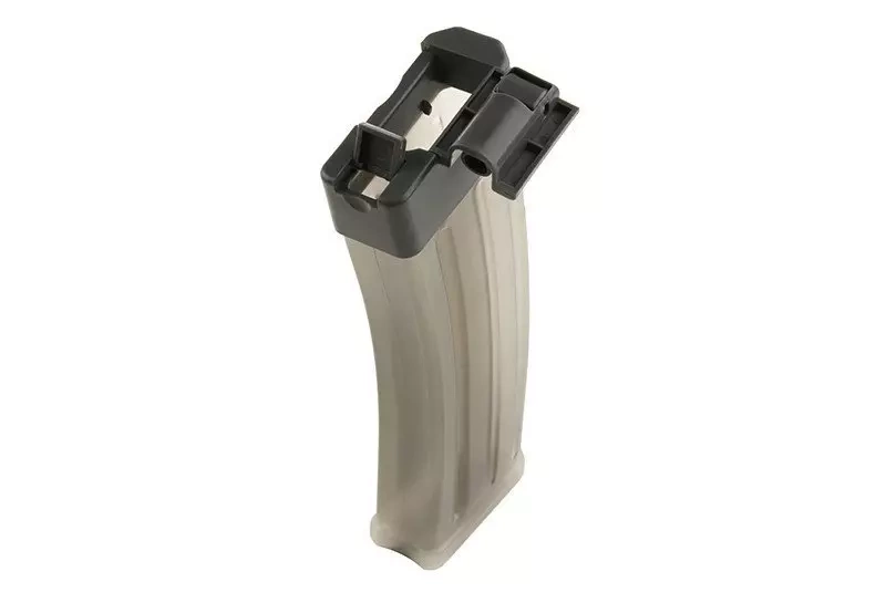 A practical container for approximately 1200 BBs. Equipped with a foldable dispenser. Produced of semi-transparent plastic, thanks to which one can control the quantity of BBs in the container.