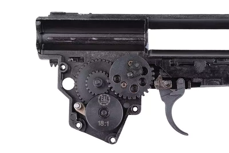 The insides of the product are also remarkable. E&L engineers have taken the best solutions on the market and added their own. The pneumatic system consists of a set of silent piston head and a cylinder, which increases the system’s longevity through better amortization. The spring slide has bearings and the piston gear has a bigger inhibitor. It gives the BB more time to be inserted in the chamber, which is of great importance in the case of high rate of fire configurations.
