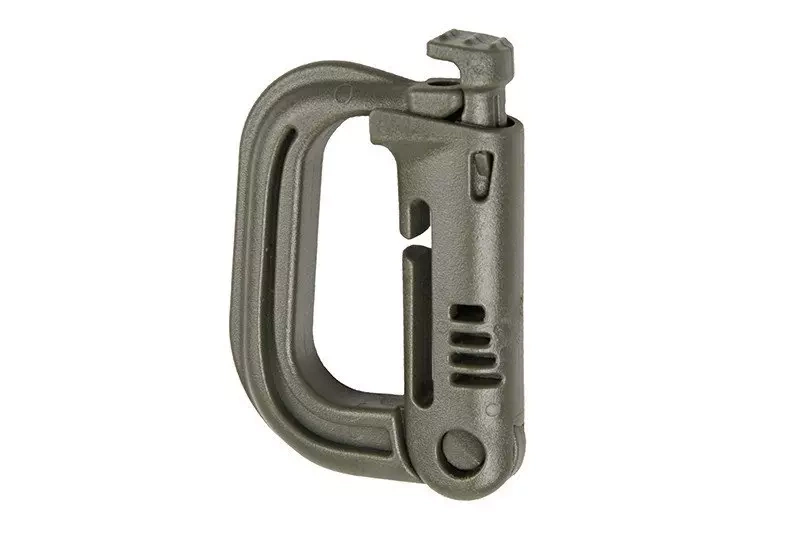 A universal carabiner locking in the shape of a D-ring, made wholly of durable plastic. Locked with use of a simple latch, constructed in a special profile allowing it to be attached e.g. onto MOLLE type straps. It is a perfect and useful add-on to any backpack or tactical vest.
