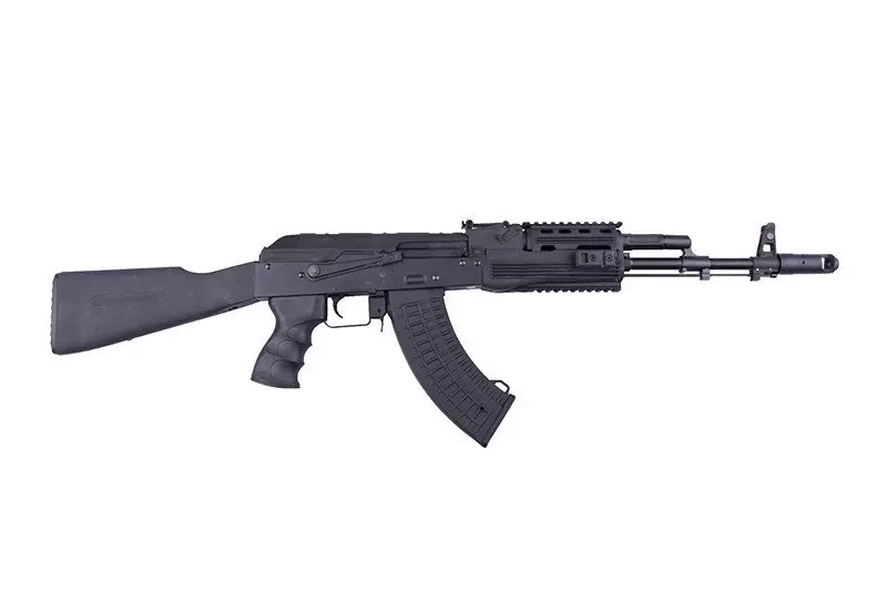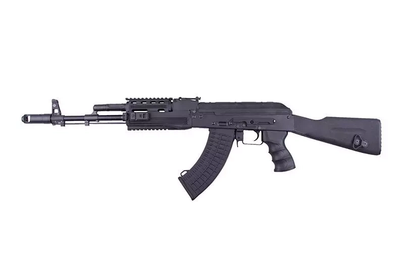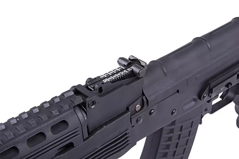 The replica is equipped with a metal hop-up chamber. It uses the very robust gearbox V.3 that is standard for AK replicas. In this case, however, it has been further modified and provided with a reinforced frame. Further reinforced parts include 7mm steel slide bearings, reinforced steel gears and a directional piston head which increases the performance of the entire mechanism.