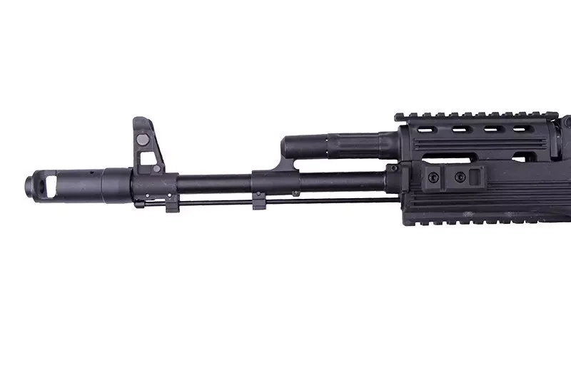 The rifle has a fixed buttstock, inside of which there is space for a battery. Access to the inside is gained by unscrewing the stock foot. On the left side of the body, we find a side mounting rail of the "dovetail" type, characteristic of these constructions, which allows dedicated optical sights or additional RIS rails to be attached to the replica. The external barrel of the replica has been finished with a left-handed 14mm thread, on which the exhaust device has been mounted.