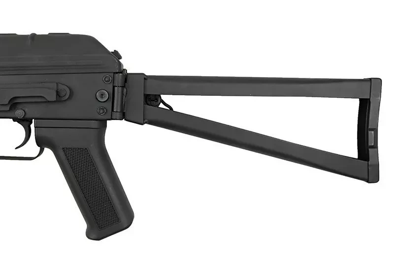 The rifle has a frame-folding buttstock. In place of the standard bed, a complete conversion with 22mm RIS mounting rails is used here, allowing the carbine to be fitted with additional accessories. On the right side is the winged fire mode selector/safety switch characteristic of AK system replicas. Also, on the left side of the body, there is a side Dovetail-type mounting rail allowing the installation of dedicated optical sights or additional RIS rails.
