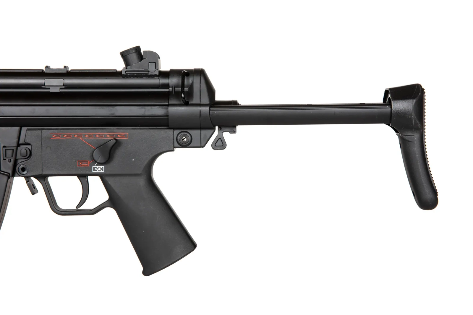 Made predominantly from Polyamide (nylon), this airsoft submachine gun features metal components such as the discharge device, stock guide and sling handle.