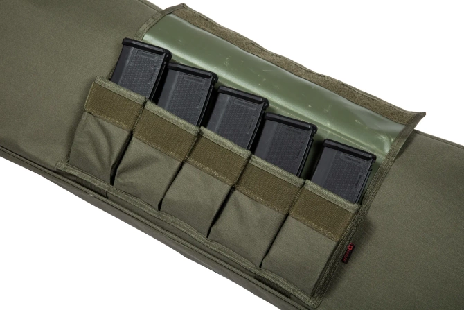 On the outside, there are 5 pouches for AR15 type magazines or accessories. The cover has a suitcase handle for transporting it around.