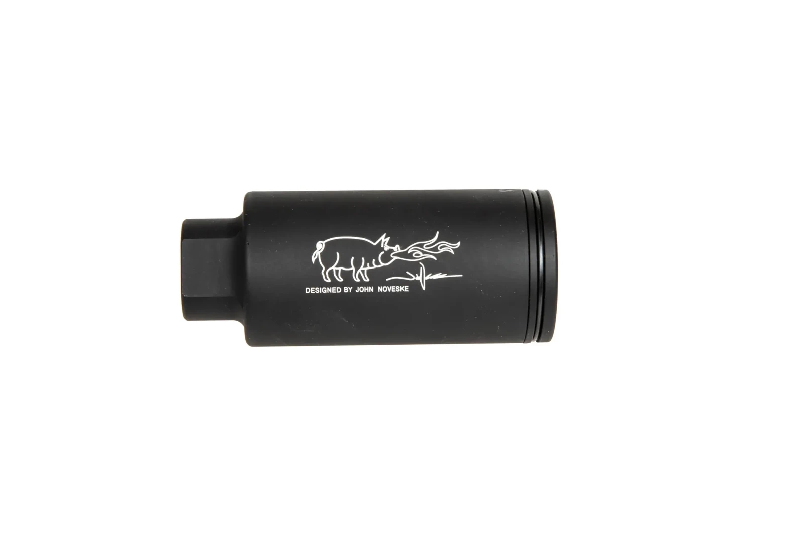A replica of the Madbull aperture device with the markings of the Noveske® brand, a manufacturer of firearms and accessories. The model amplifies the sound of the shot, focusing the air coming out of the barrel through the conical cartridge in one direction. The casing of the silencer is made of CNC machined anodized aluminum. The Amplifier is made out of blackened steel.
