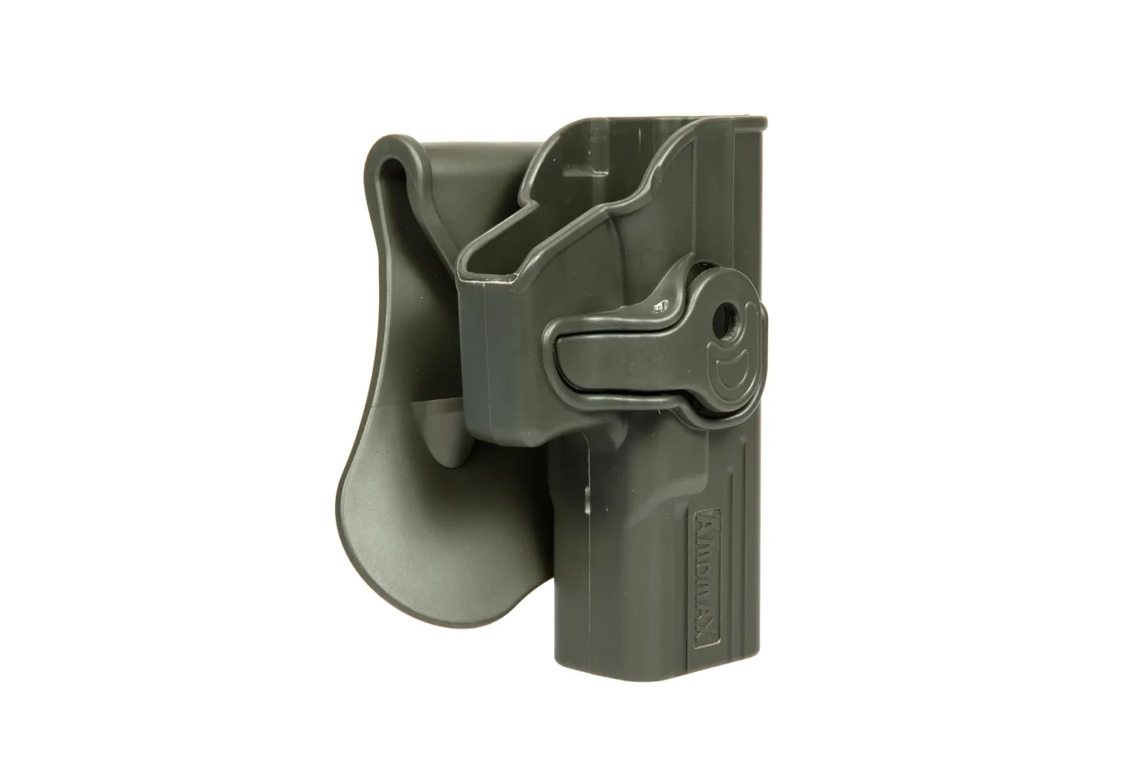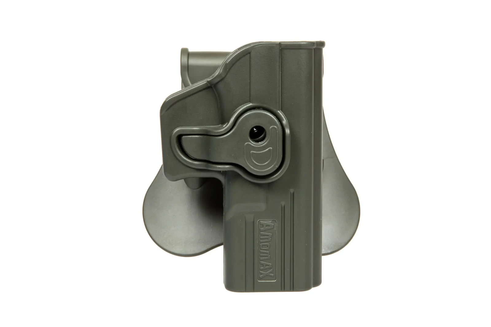 Holster for popular G series replicas made out of durable polymer manufactured by Amomax. The clamping system works in an intuitive way and the holster itself is compatible with replicas of the most popular manufacturers such as WE, TM, Umarex, Army