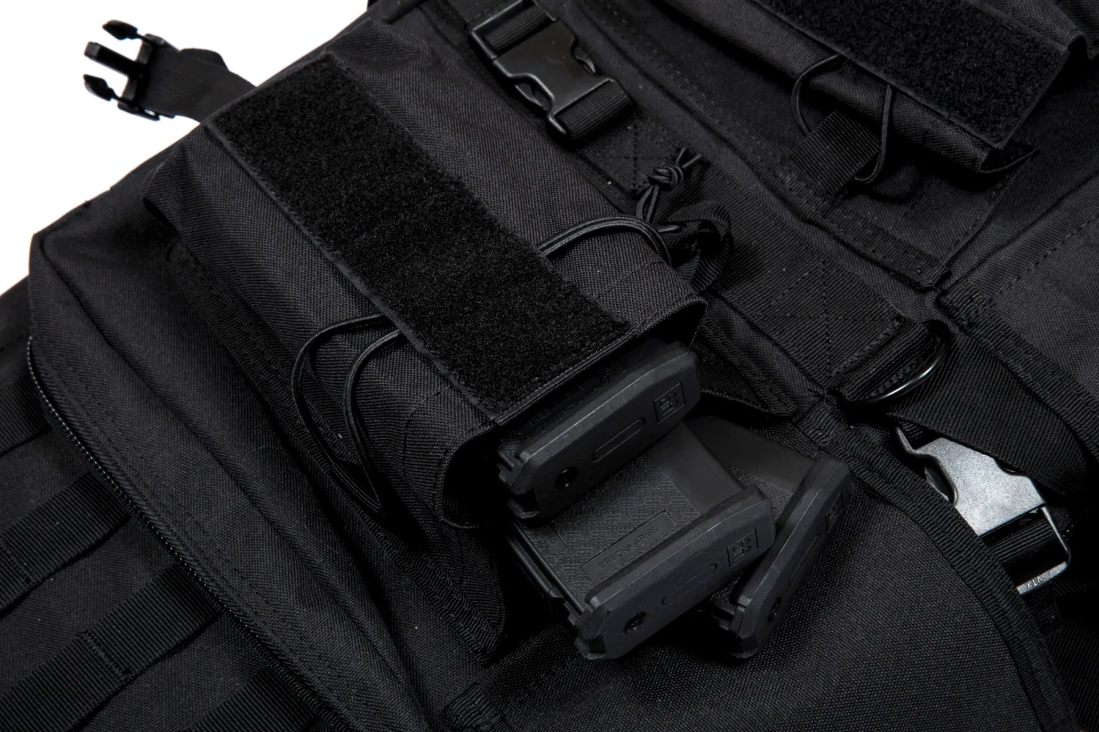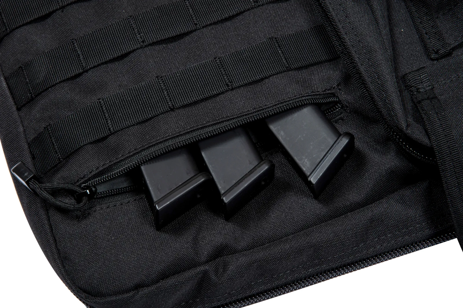 On the front wall of the rifle bag there is a second, smaller compartment with dimensions of 660x250mm with internal compartments (for example a handgun or even a submachine gun), as well as a number of spacious pockets for additional accessories, magazines, etc. The pockets have shockcord cuffs and are closed with fastex and Velcro.