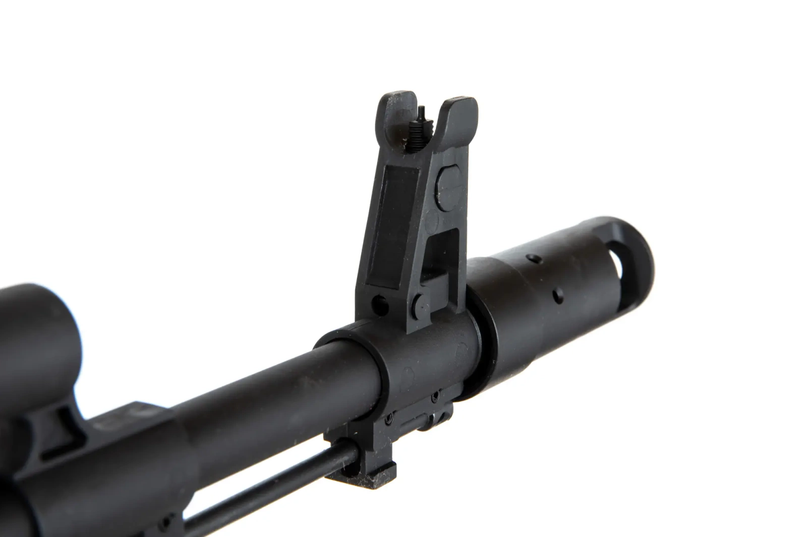 Specna Arms J-Series ™ CORE ™ carbine replicas are made primarily out of durable polymer reinforced with nylon fiber, making the replica lightweight and comfortable to use. The pistol grip, the receiver with the handguard with the gas tube overlay, the elbow and the front sight are made of polymer. The most crucial elements, such as the barrel mount, dummy bolt carrier, rear sight, front mount, barrel and front sight are made out of zinc and aluminum alloy. The dust cover, safety, trigger guard and the stock are made out of steel.