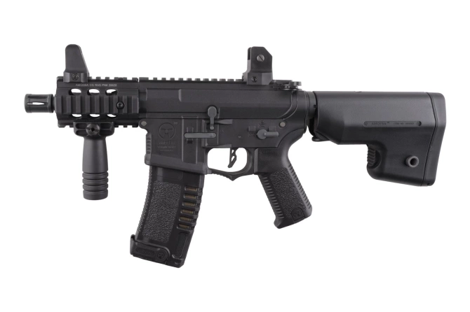 The replica's receiver was made of strengthened nylon. Quality of the materials used results in the fact that it is very difficult to recognise on the first sight whether it's plastic or metal. Effective signs of a model, calibre and Amoeba Airsoft's logo were engraved on the receiver. Metal was used to produced the outer barrel, the front-sight, the flash hider, the stock tube and some small pieces. The pistol grip, properly shaped, covered with scrabrous non-slip texture which improves grip and comfort. The magazine release button was enlarged in order to make its usage easier.