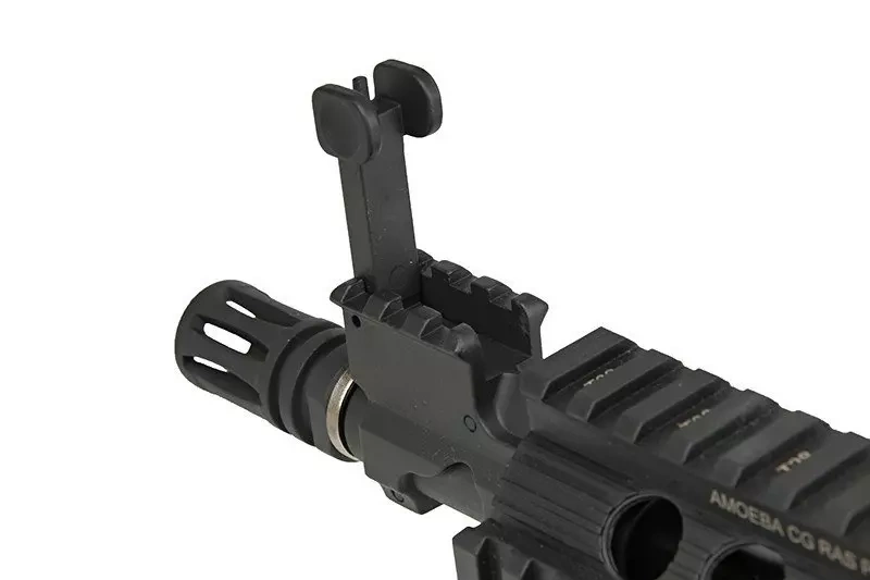 The replica's receiver was made of strengthened nylon. Quality of the materials used results in the fact that it is very difficult to recognise on the first sight whether it's plastic or metal. Effective signs of a model, calibre and Amoeba Airsoft's logo were engraved on the receiver. Metal was used to produced the outer barrel, the front-sight, the flash hider, the stock tube and some small pieces. The pistol grip, properly shaped, covered with scrabrous non-slip texture which improves grip and comfort. The magazine release button was enlarged in order to make its usage easier.