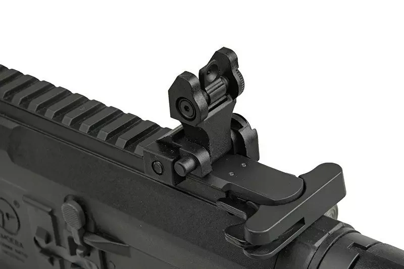AM-009 was equipped with a modular system of the front grip, which allows to adjust the replica to individual preferences of the shooter. 22mm RIS rails' segments may be mounted to the replica in many positions thanks to sockets located around the grip. 3 such segments together with mantling screws were included to the set. The all-purpose 22mm RIS rails are situated on the front grip and on the top of the receiver, thanks to which the replica may be fitted with a wide range of additional accessories, from a scope to lighting and tactical grips. The rifle has iron sights - flip-up type aming devices mounted on the RIS rail.