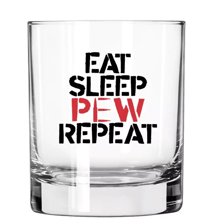 Whiskey glass with a EAT SLEEP PEW REPEAT print.