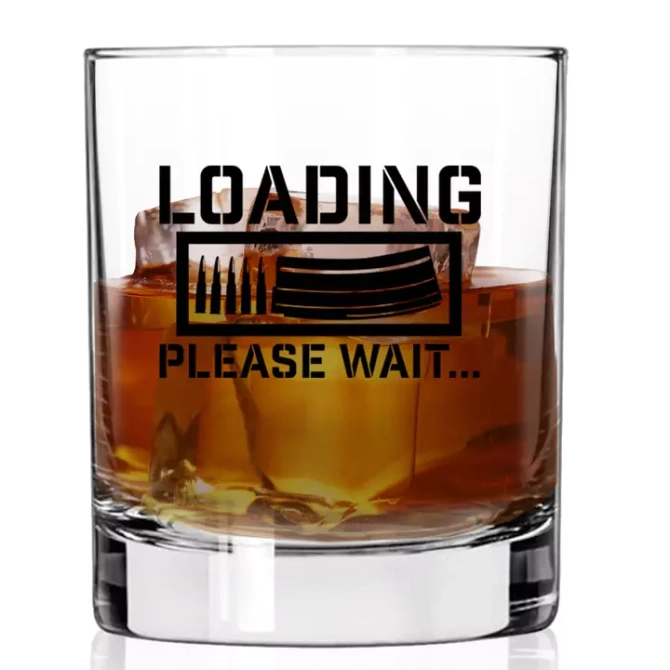 Whiskey glass with a LOADING PLEASE WAIT print.