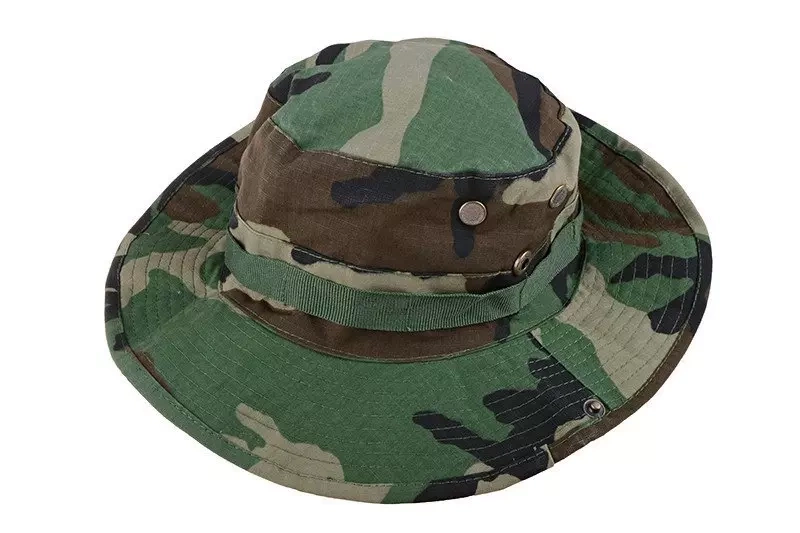 The hat of the popular design of the so-called Boonie Hat, made of tear-resistant Rip-Stop fabric. It is a classic, well-known pattern with a wide brim and a strap running around the hat for additional masking.