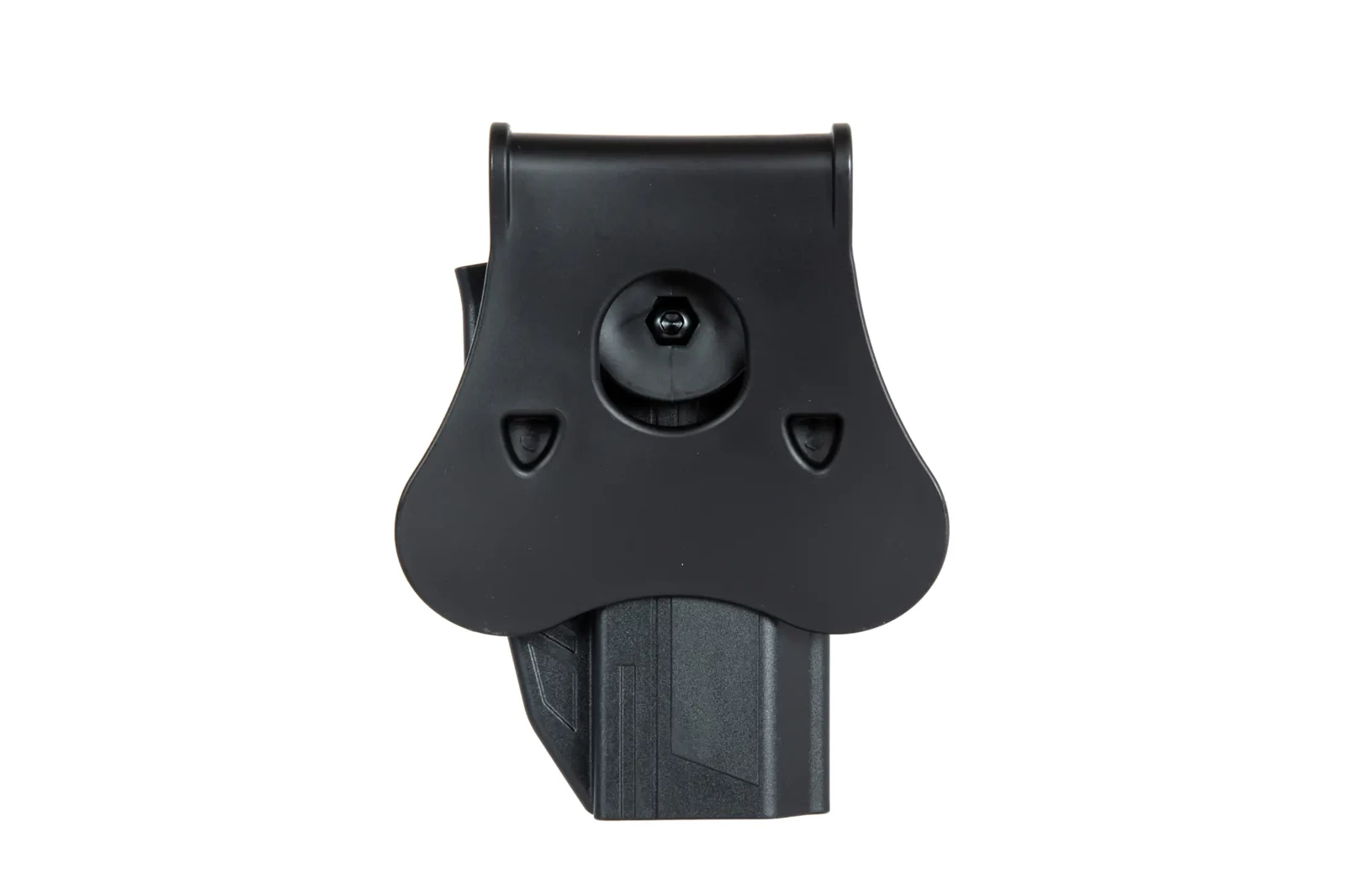 Made from polymer, this pistol holster is made by Amomax. Polymer holsters are characterised by a good grip on the replica, stiffening the carried pistol, affecting the comfort during the user's actions.