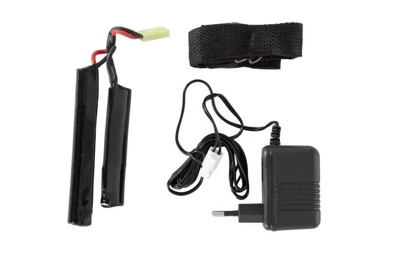 The replica includes a hi-cap magazine made from steel and plastics holding 300 pellets. The battery is located inside the SF type stock.
