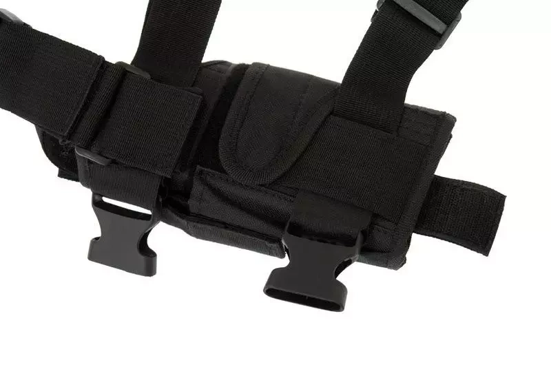 The holster is made of nylon. Thanks to the use of hooks&loops bands it is possible to adjust and adapt the holster to any replica. The holster has got a universal application. The adjustable thigh bands are closed with the use of buckles. It is also possible to fully unclip the straps depending on the user’s needs. The hip belt mounting strap is also equipped with a buckle which allows for a quick detachment of the holster from the belt. There is a pistol magazine pouch located on the top of the holster.