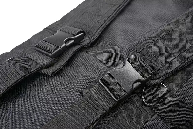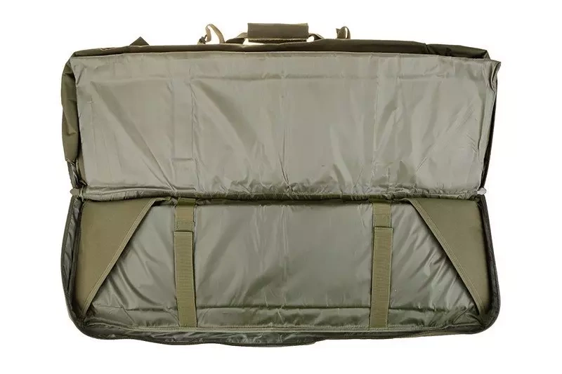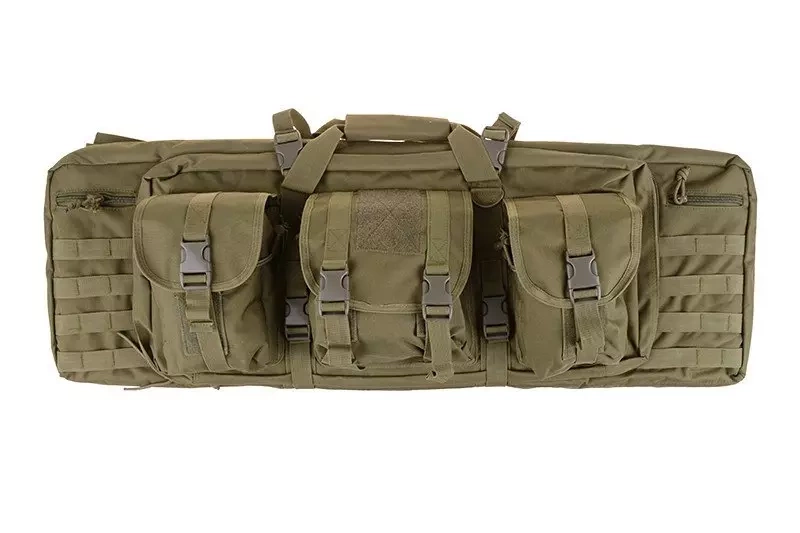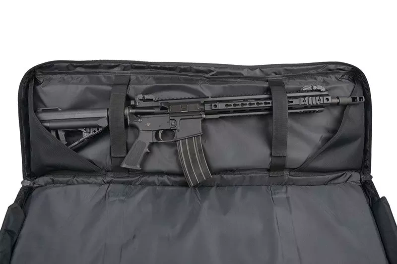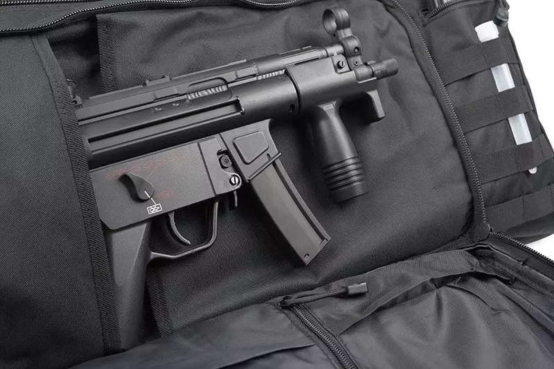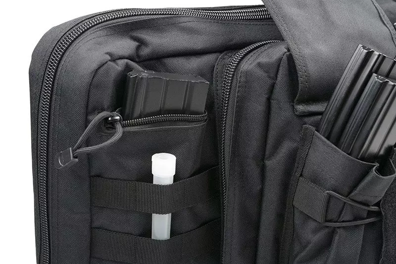 The front side of the bag has another, smaller compartment with 660x250mm dimensions, which has smaller chambers and fits perfectly for pistol or even submachine gun guns. The additional pouches can hold various accessories, magazines etc. These pouches are secured by rubber welts as well as hook&loops straps and fastex clips. If it isn't enough the bag allows for additional pouches installed in a MOLLE standard. Sides of the main compartment have cushioning made from thick foam, which guarantees that replica's will reach their destination safely.