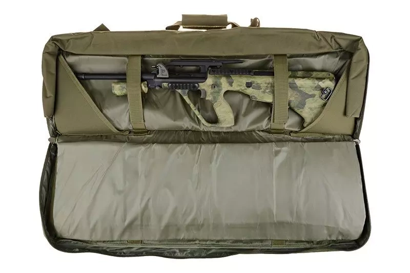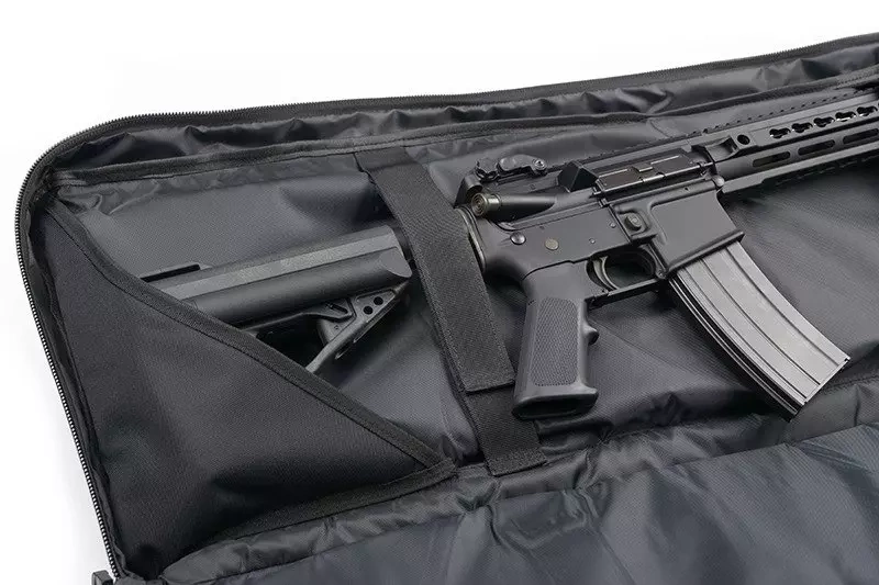 A solid GFC made bag for guns, made from durable nylon. It has large main compartment partitioned into two chambers, it's structure allows for comfortable transportation of two guns of 900mm maximum length. The compartment is locked with two way zipper. Inside there are hook&loops straps and barrel/stock handles for stable securing of the guns.
