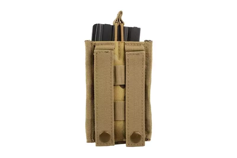 A universal, single, shingle pouch sewn from a durable nylon. The pouch stores a single M4/M16 (STANAG) / AK / G36 magazine. The magazine is secured against falling out from the top by an elastic shock-cord.The pouch is compatible with MOLLE webbing system, which means it can be attached to all kinds of vests, belts and backpacks.