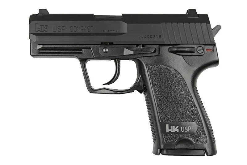 Umarex presents a spring replica of a well-known german H&K USP Compact pistol replica. The manufacturer is known for cooperation with firearms manufacturers and this time they received full Heckler & Koch license too. Thanks to that the replica's body and the box were decorated with real firearm signs, the same as on the regular H&K USP pistols.