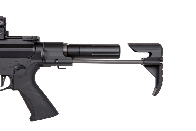 - Upper and lower body along with a 6-position stock rail made from T6065 aluminum