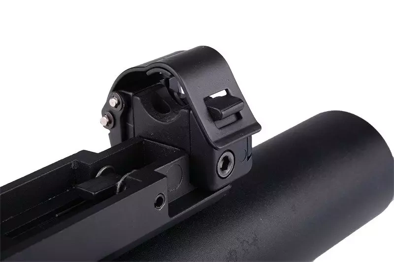 Wykonana w większości z metalu replika popularnego granatnika M203 w wersji Long. Airsoftowy odpowiednik tego granatnika jest zasilany z standardowych granatów 40mm (brak w zestawie) miotających kulki za pomocą gazu. Newralgiczne części narażone na zużycie zostały wykonane ze stali. Jedynym elementem wykonanym z tworzywa jest żebrowany chwyt granatnika.