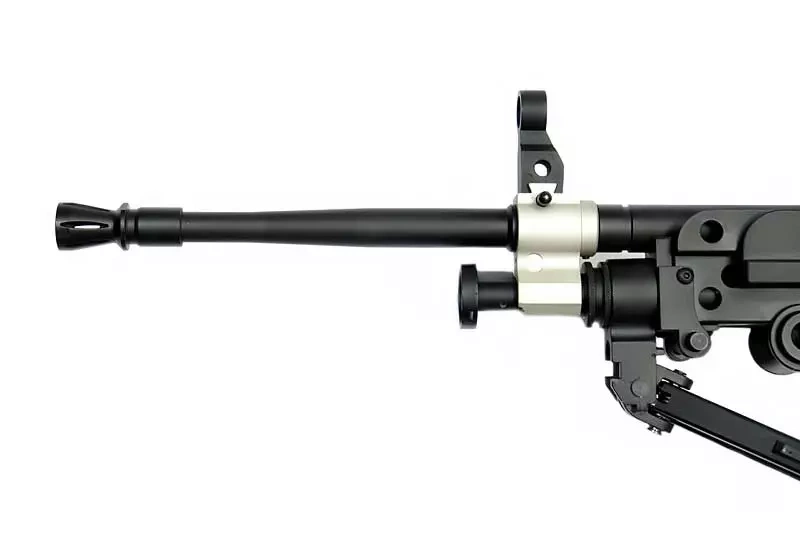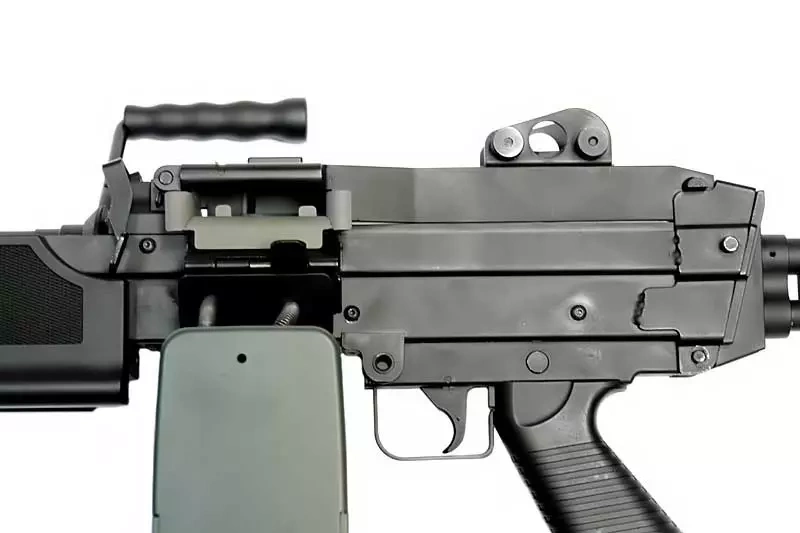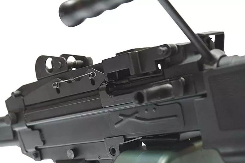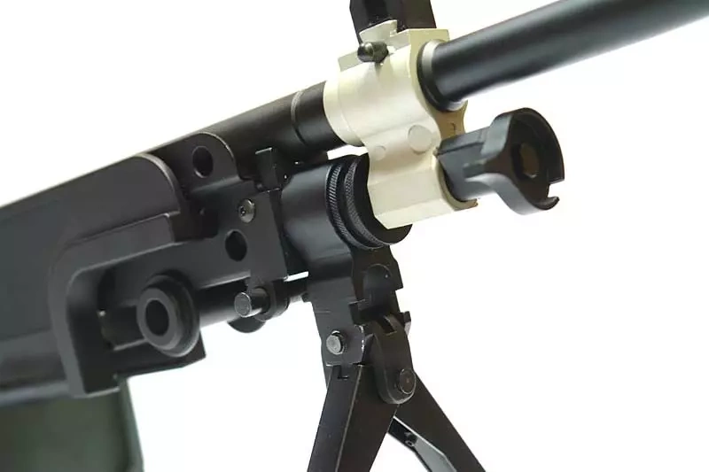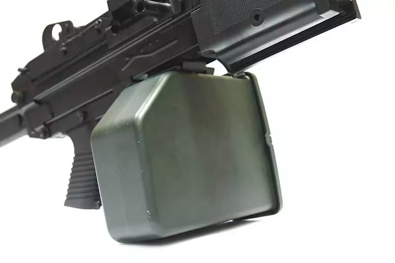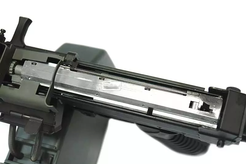 Replica is made from hi quality metal and ABS. Body, stock, chamber cover, outer barrel, sight's and bi-pod are made of metal while box magazine, pistol grip and front grip are made of ABS. Special type gearbox used allow's for extrene tune up. Magazine is made of ABS and has capacity of 2400 BB's. It is powerd by set of two AA batteries and it may be set to Auto mode, Sound Controll and OFF.