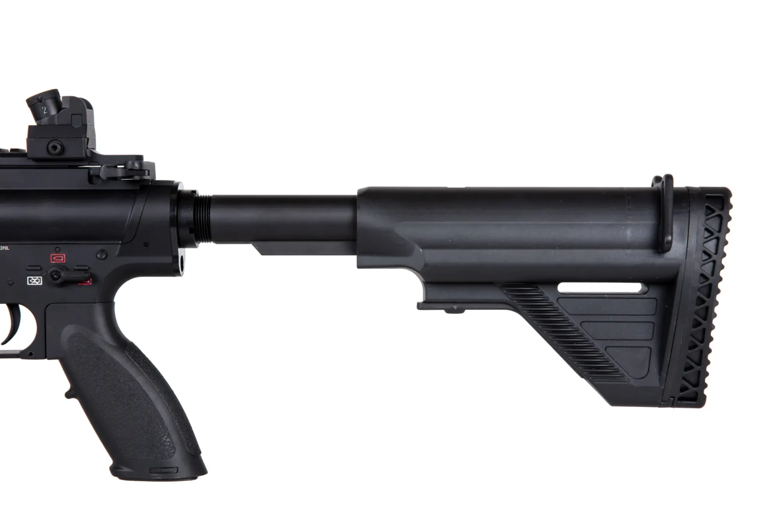 - Adjustable 6-position stock with two sling swivel mounts and a battery compartment, ending with a rubberized buttplate.