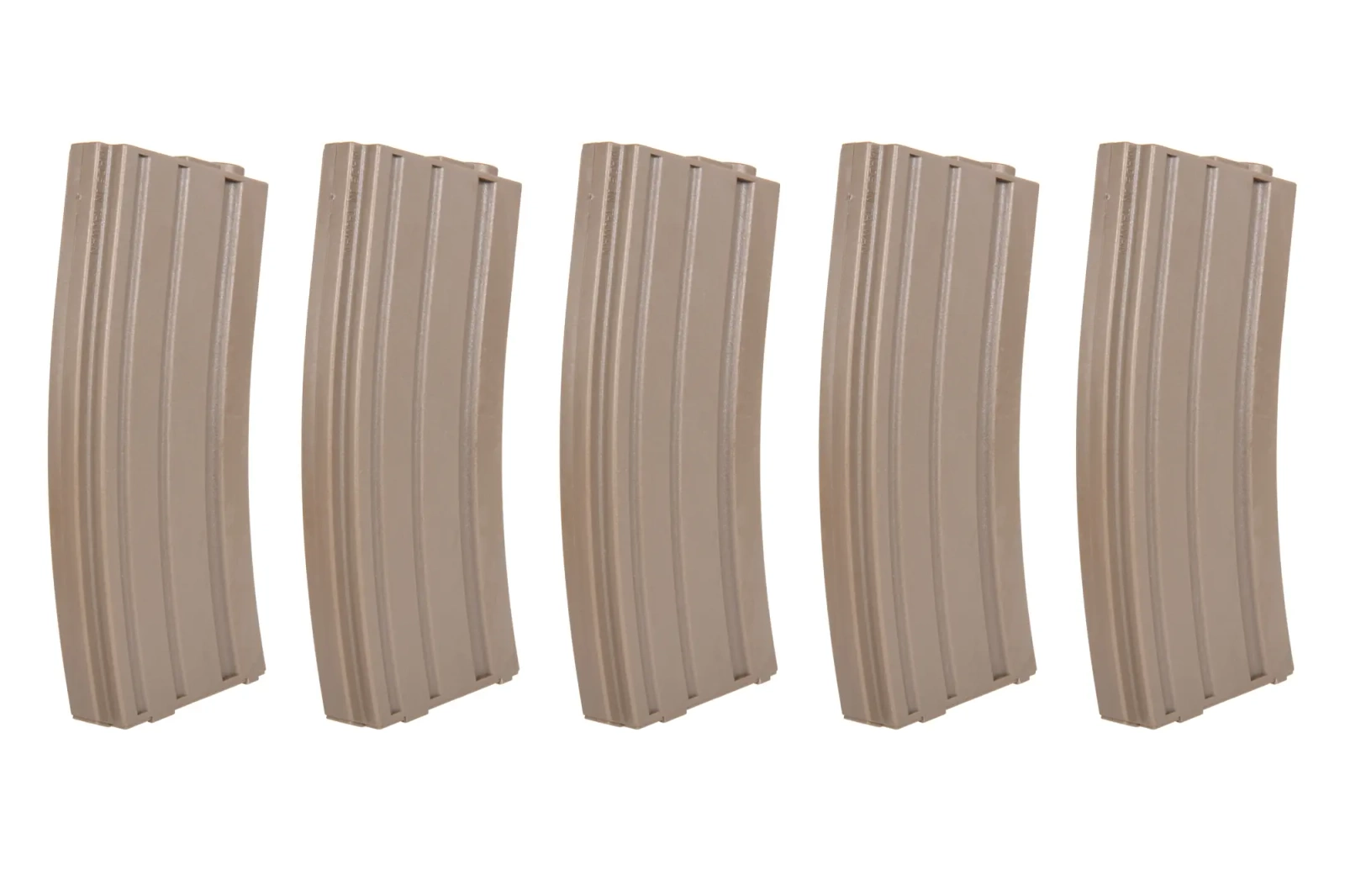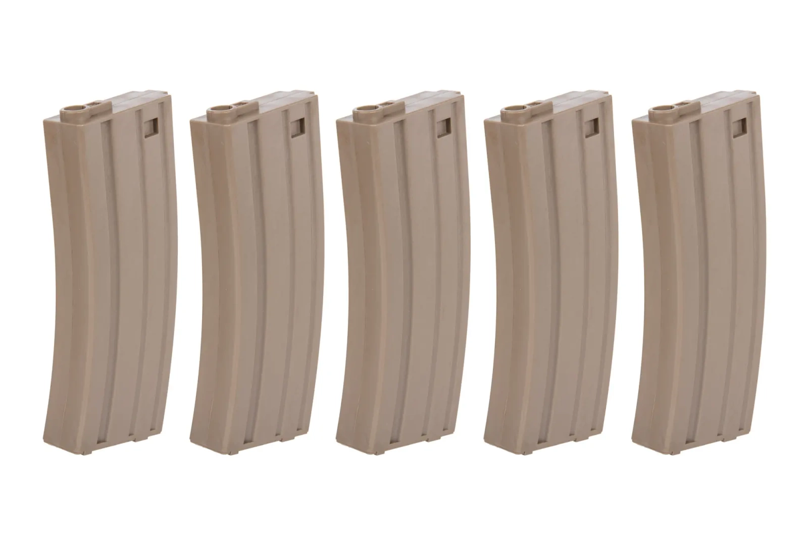 Set of 5 STANAG-type polymer magazines for AR/M4 mid-cap type with a capacity of up to 140 balls.