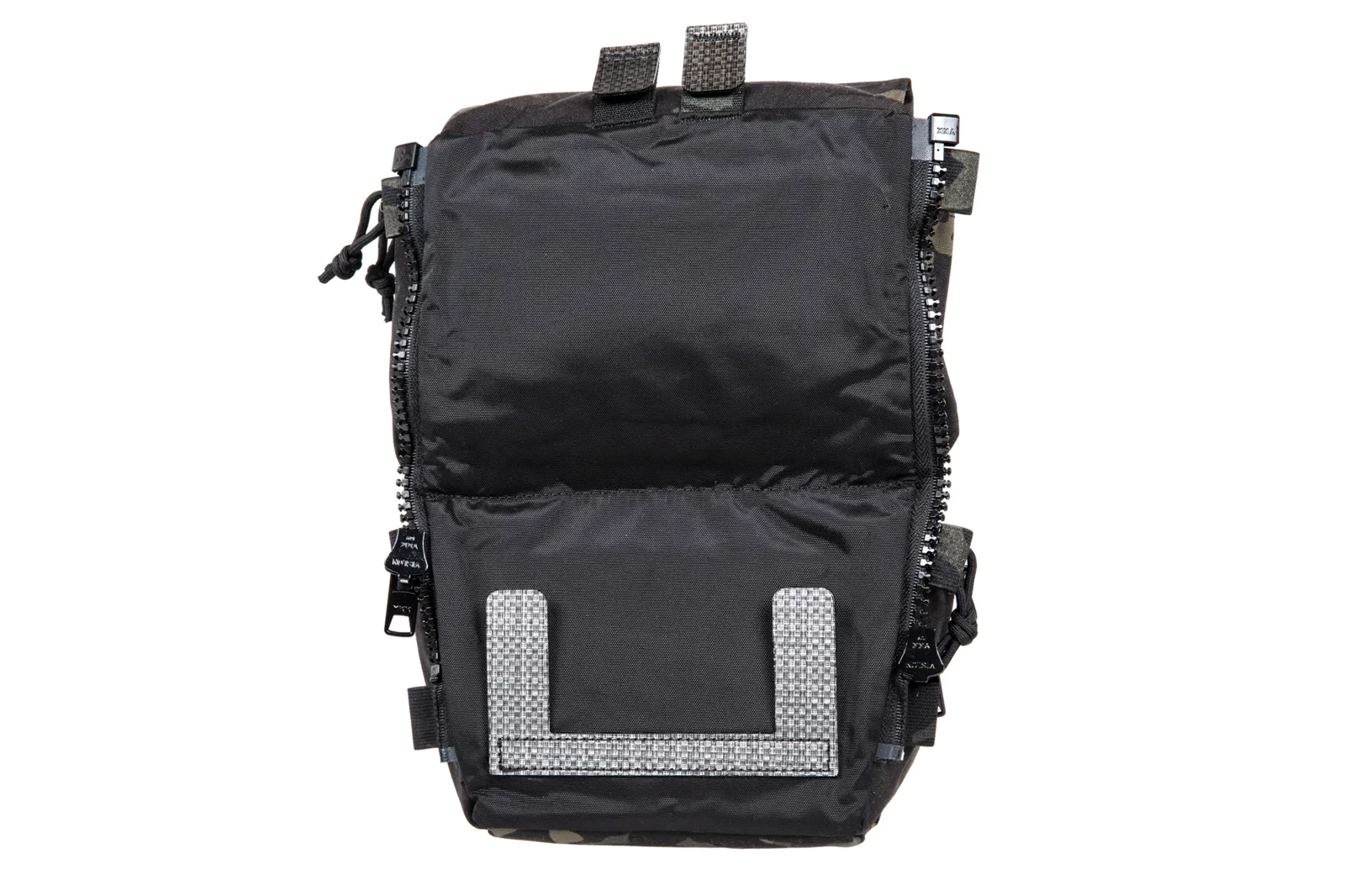 The practical and durable assault panel features two independent pockets closed with two-way YKK zippers