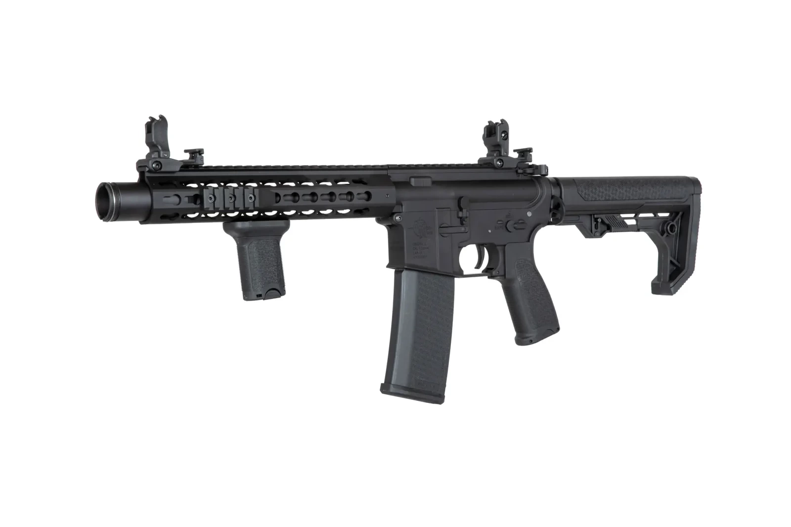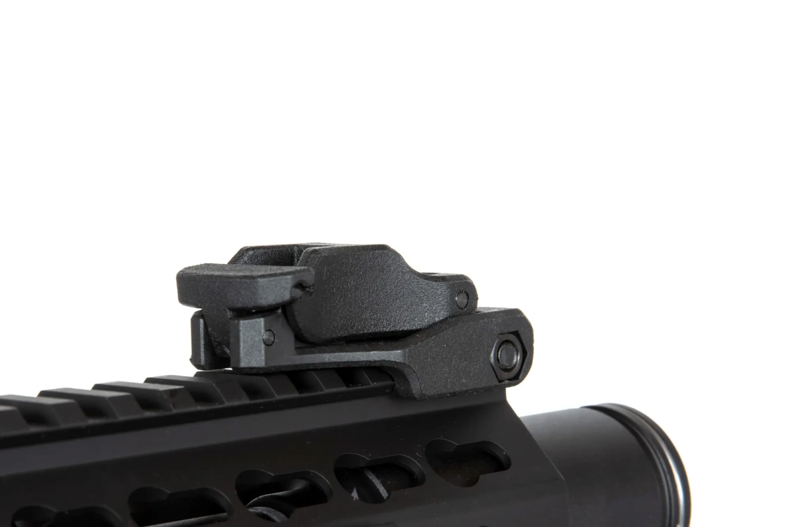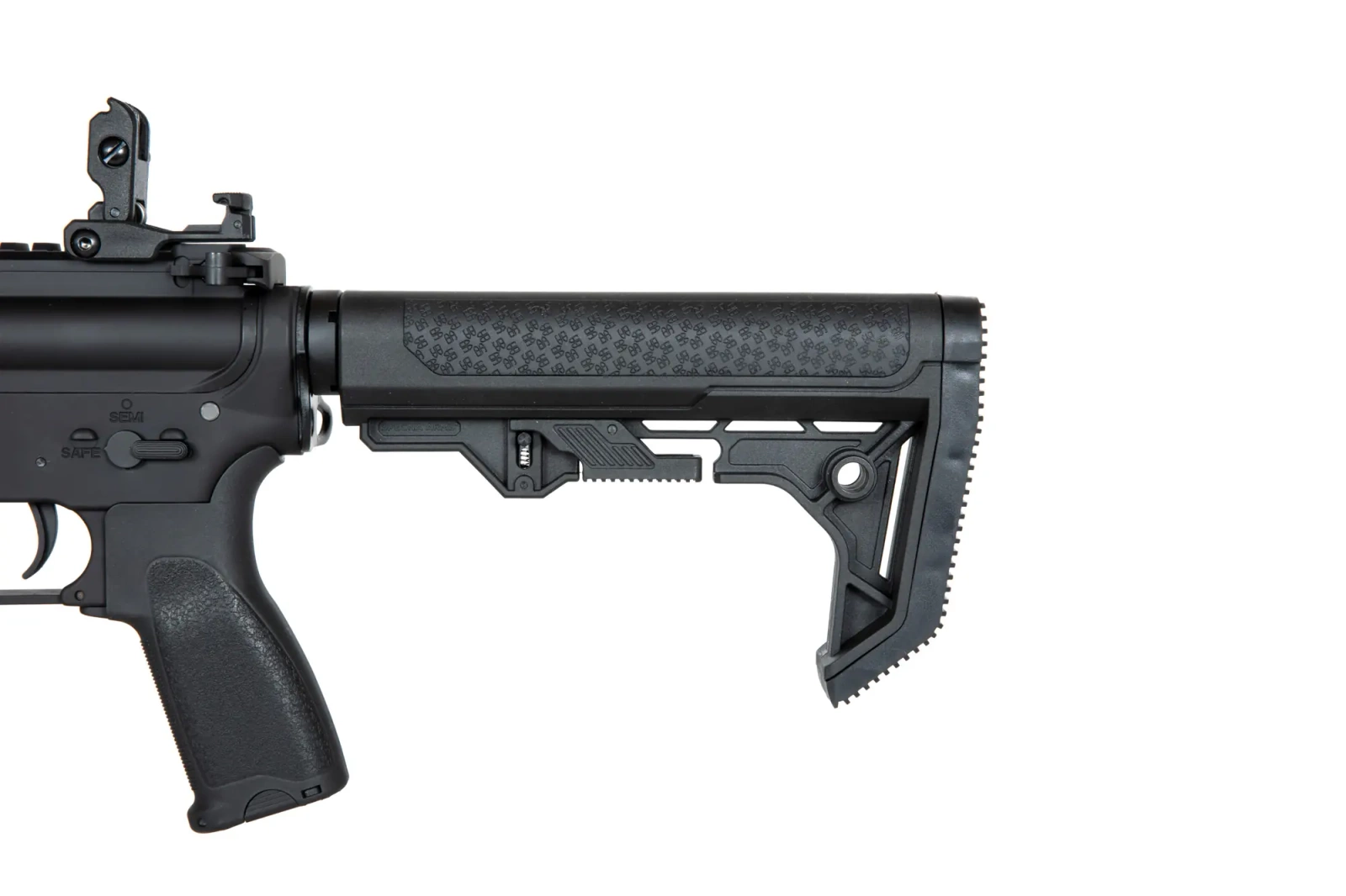 The SA-E08 carbine replica is equipped with a front rail in the mounting system KEYMOD on which various tactical accessories can be mounted: torches, grips, laser pointers or optical sights. The kit includes 3 sections of mounting rails. On the long, dorsal rail there are folding sighting instruments. In turn, the barrel of the replica is finished with a standard exhaust device mounted on a 14mm CCW thread.