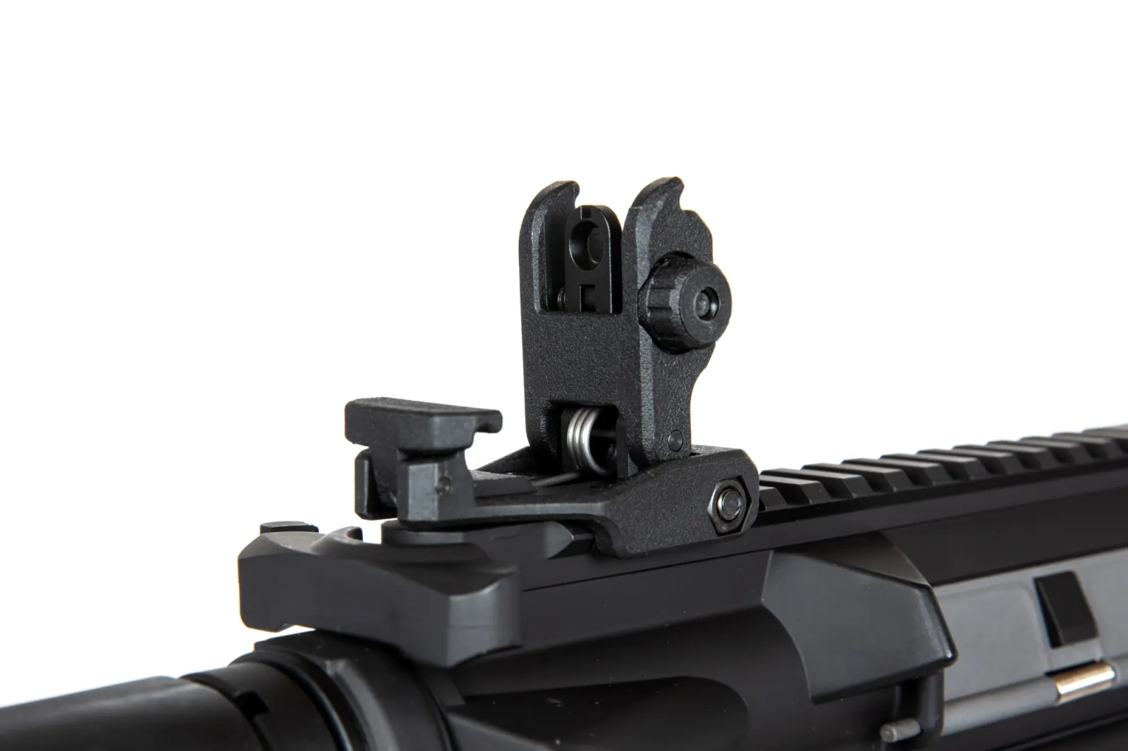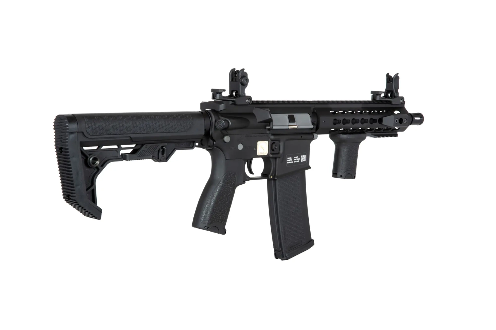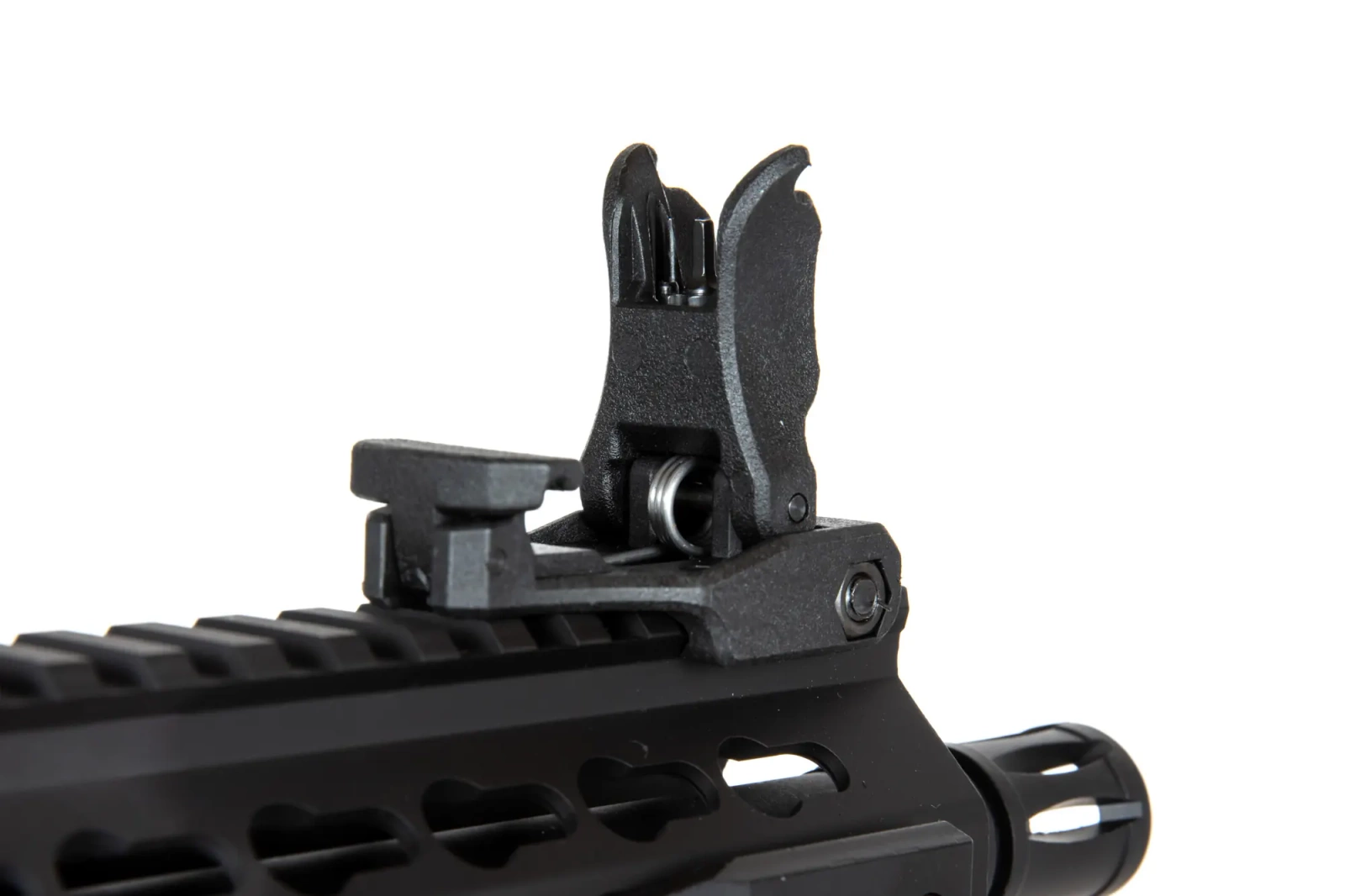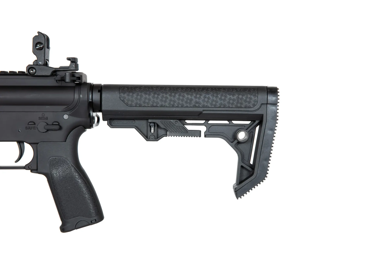The SA-E08 carbine replica is equipped with a front rail in the mounting system KEYMOD on which various tactical accessories can be mounted: torches, grips, laser pointers or optical sights. The kit includes 3 sections of mounting rails. On the long, dorsal rail there are folding sighting instruments. In turn, the barrel of the replica is finished with a standard exhaust device mounted on a 14mm CCW thread.