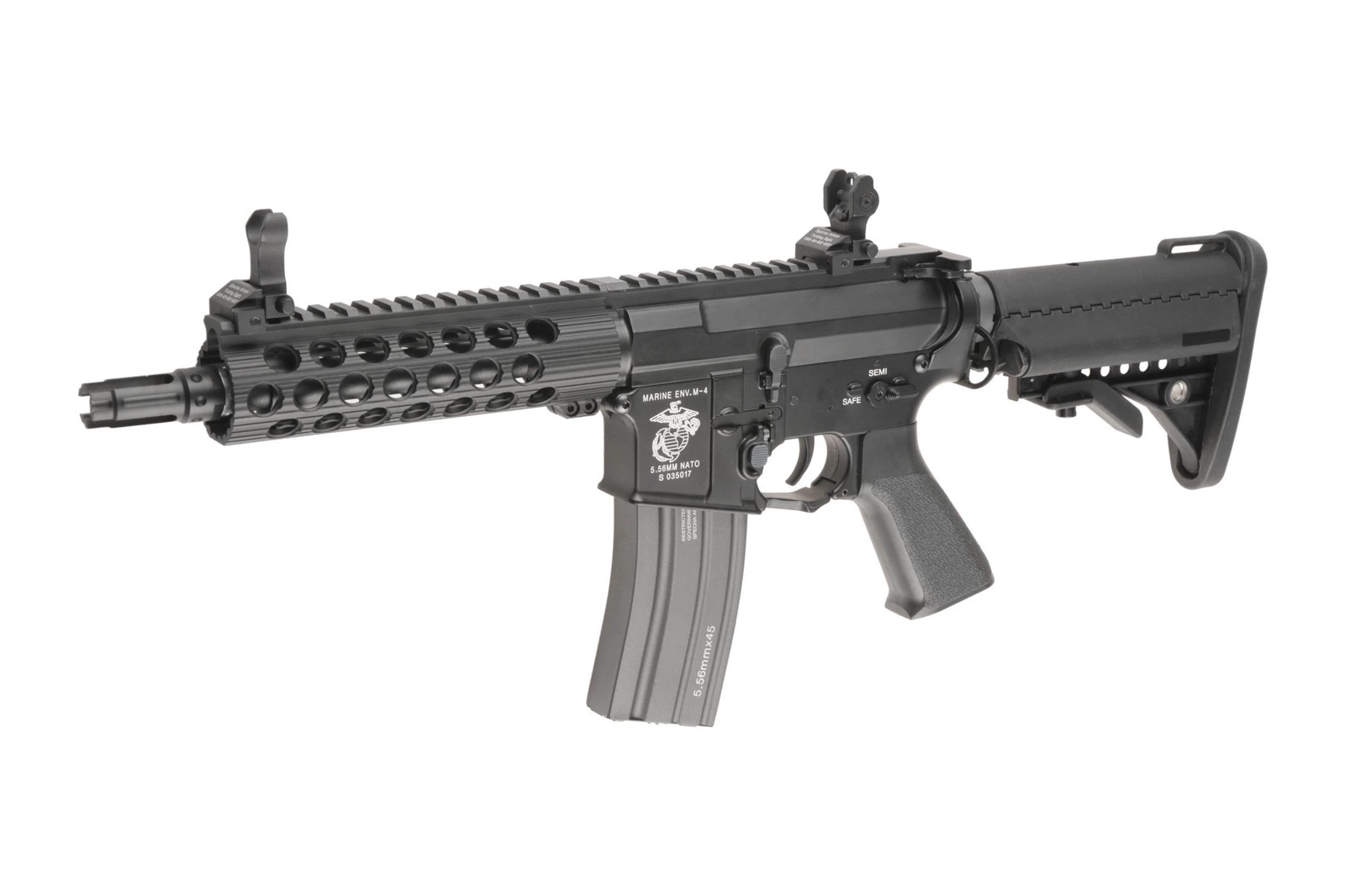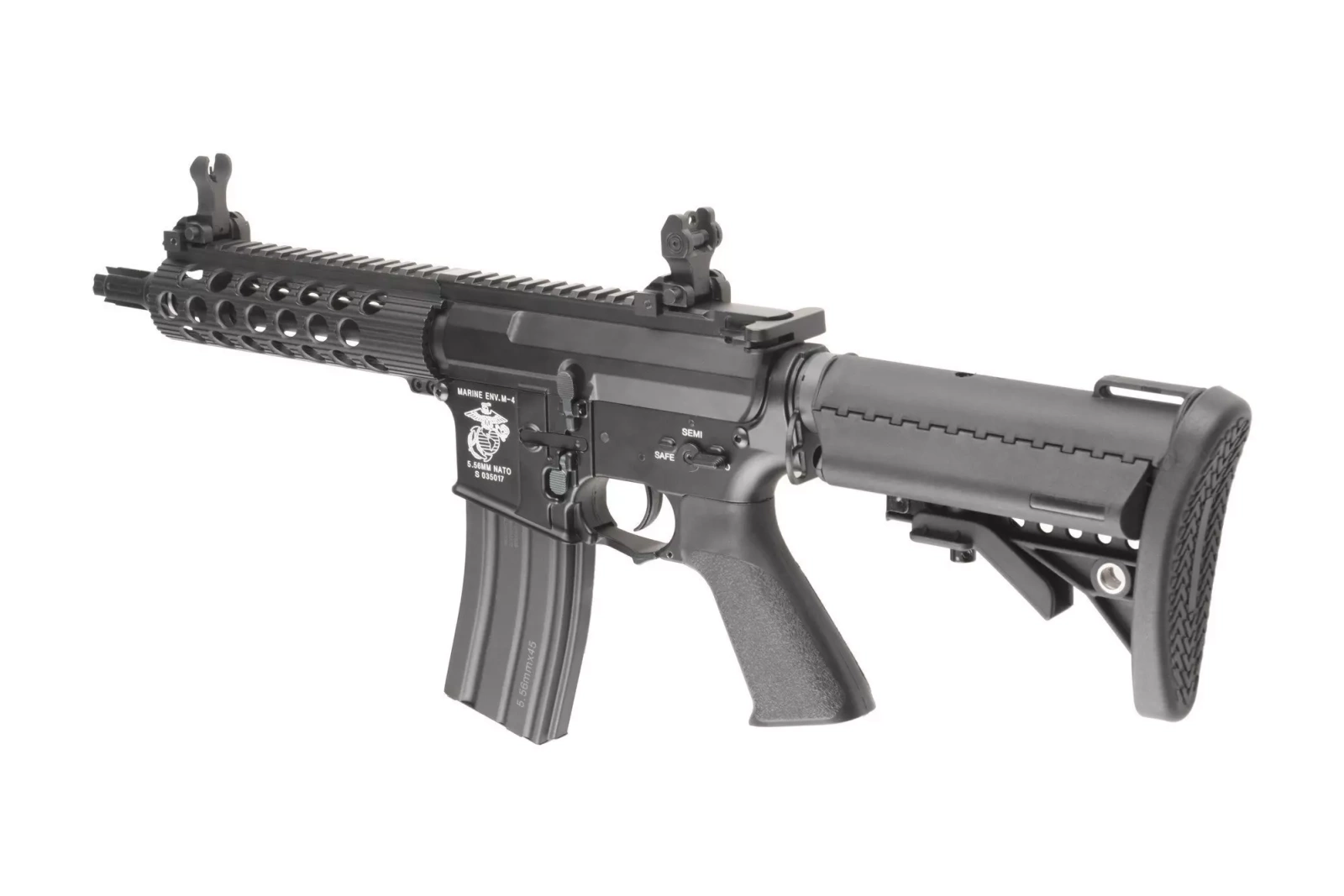 The SA-K04 airsoft rifle by Specna Arms has been made predominantly from a uniform zinc-aluminium alloy, with the use of steel elements at the most critical points of the replica (so all screws, pins and the tactical sling mount are steel). The SF type stock, which houses the battery, as well as the pistol grip, are made of polymer polymer. The body of the replica and the RIS rail assembly have been subjected to the anodising process, which guarantees a high degree of protection of the replica against corrosion. The painting of the replica itself was done by a powder coating process, after the surface had been sandblasted. This ensures that the applied paint is much more abrasion resistant than usual. The USMC markings have been applied to the barrel.