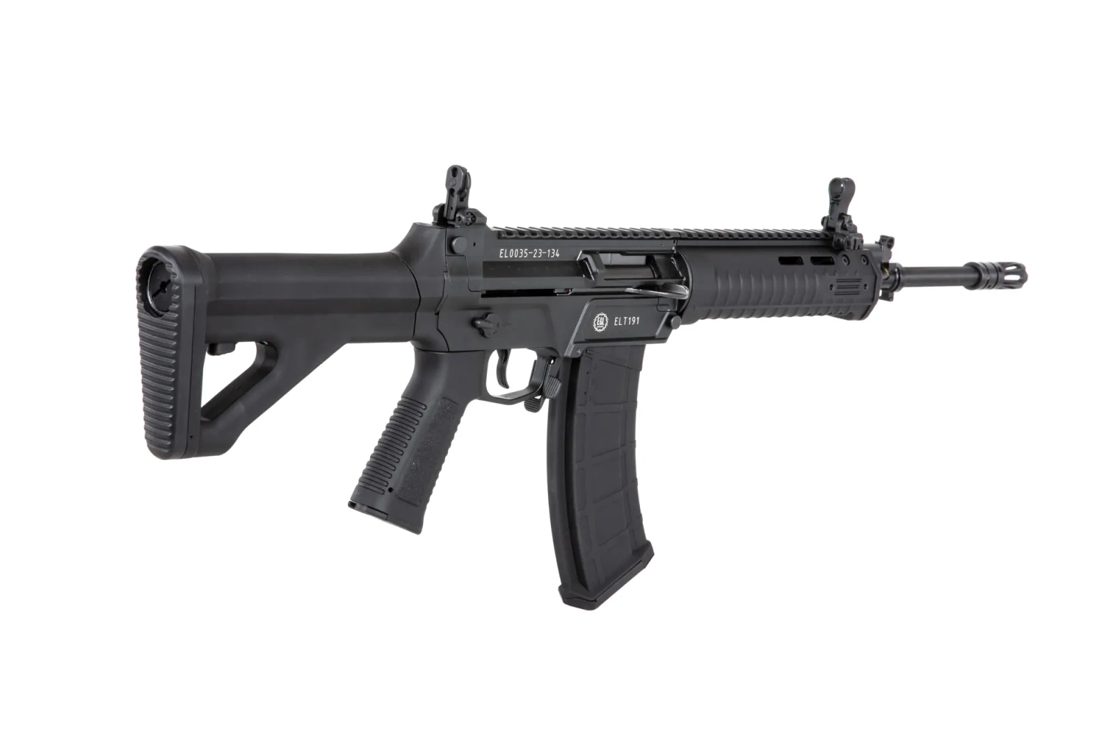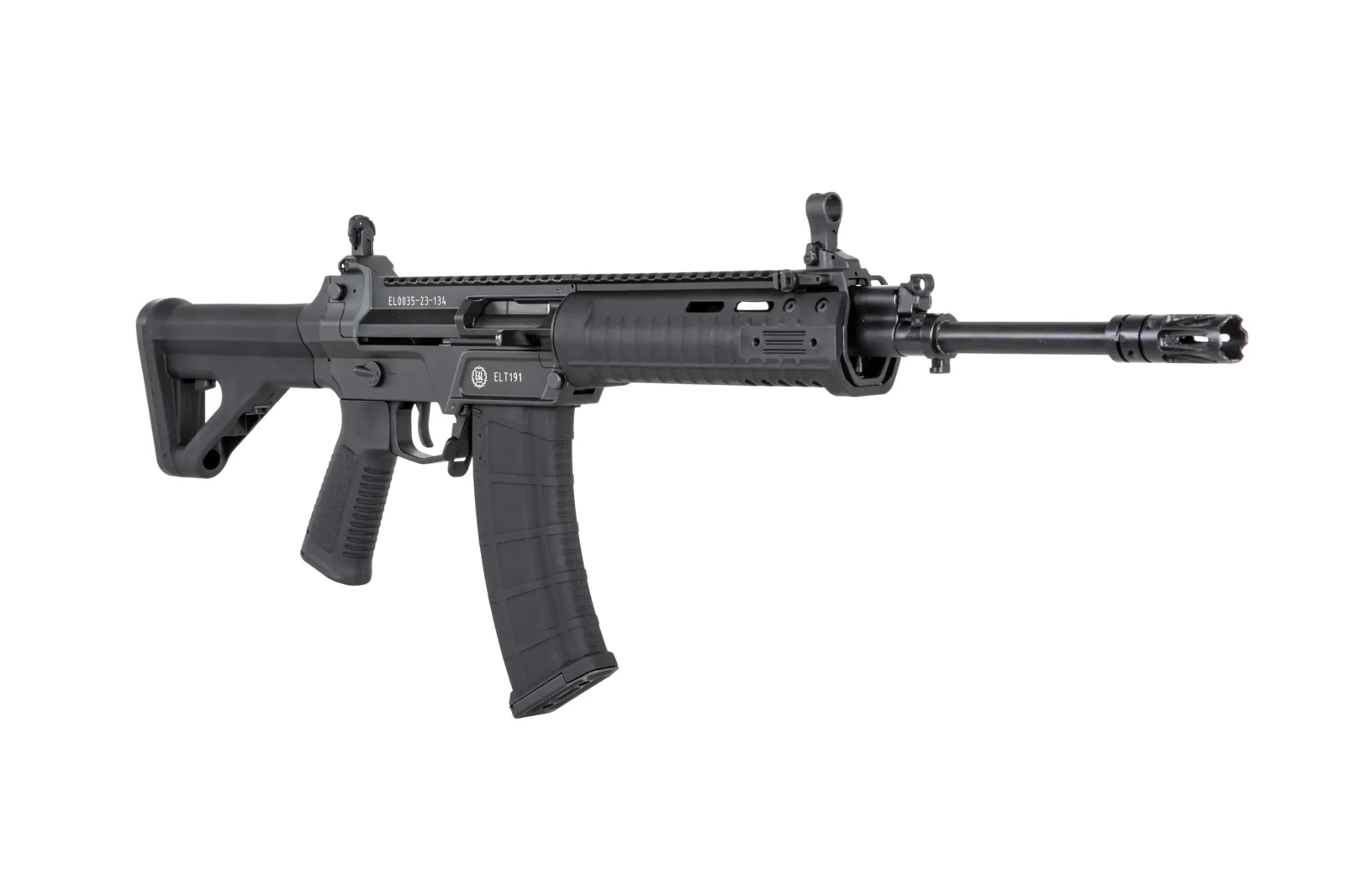 ELT191 is powered by a proprietary,hybrid power system. The replica can be powered by 33 gram CO2 capsules placed in the stock guide or on an HPA with a valve in the grip. The operation of the replica is extremely realistic, the steel slide guarantees strong blowback.