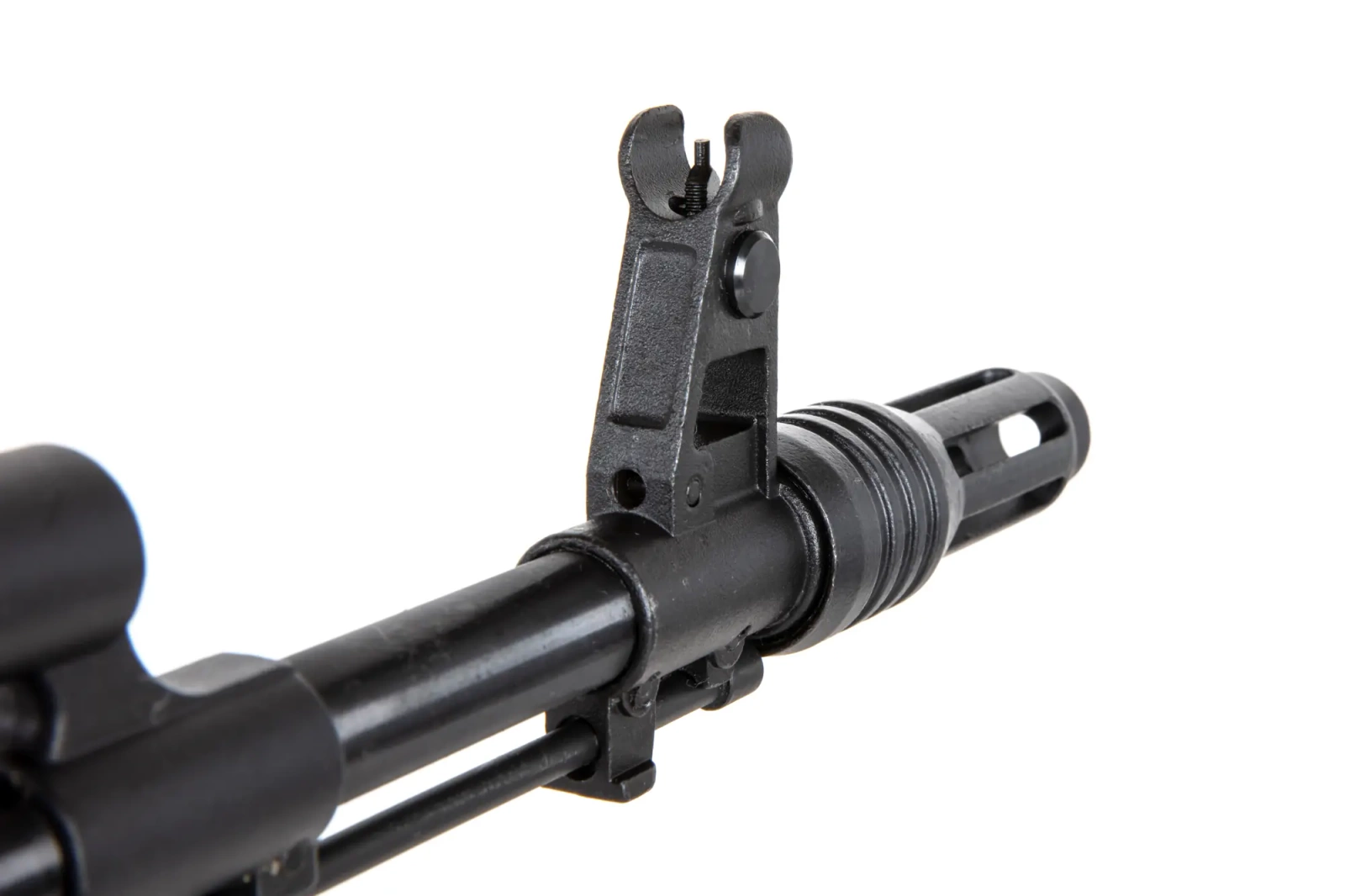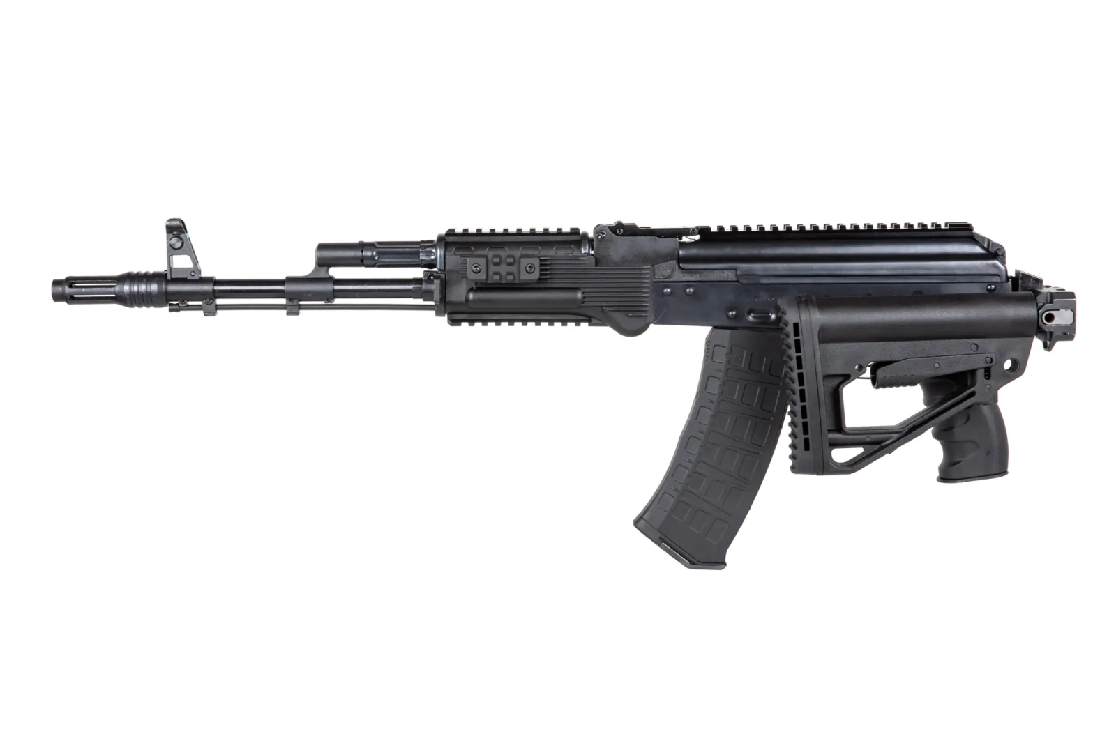 ELAK 74 M3 is a replica of the AK RMO carbine (????????-???????????????? ????? - Repair and Modernisation Kit) or KM-AK (???????? ???????????? - Modernisation Kit), that is, a refurbished, equipped AK-74 modernisation kit with a new barrel. The AK-RMO is an answer to the requirements of the modern battlefield prepared for old worn-out AK-74 carbines. The kit consists ofa slotted flame suppressor also acting as a compensator to facilitate night vision shooting. New handguard and gas tube cap fitted with RIS rails to allow the mounting of additional accessories. New, simplified stock known from the AKS-74U. Hinged locking chamber cover with RIS rail allowing for secure mounting of optics. Ergonomic pistol grip, functional magazine, extendable and folding stock and fire mode switch familiar from the AK-12. Thanks to the new barrels and the possibility of fitting aftermarket accessories, tuning parts for other AK series carbines (Zenitco, VS, Hexagon, etc.), reliability, ergonomics, it has gained sympathy among Russian soldiers and is more desirable to scouts and commandos than the AK-12 carbine. In the firearm version, the kit also included a sound suppressor, carrying belt, pouch and vertical grip.