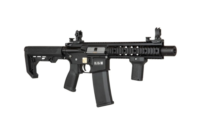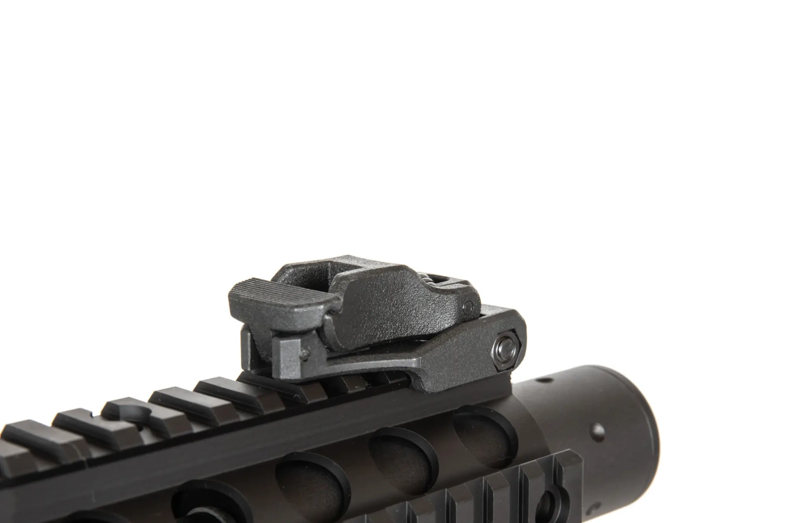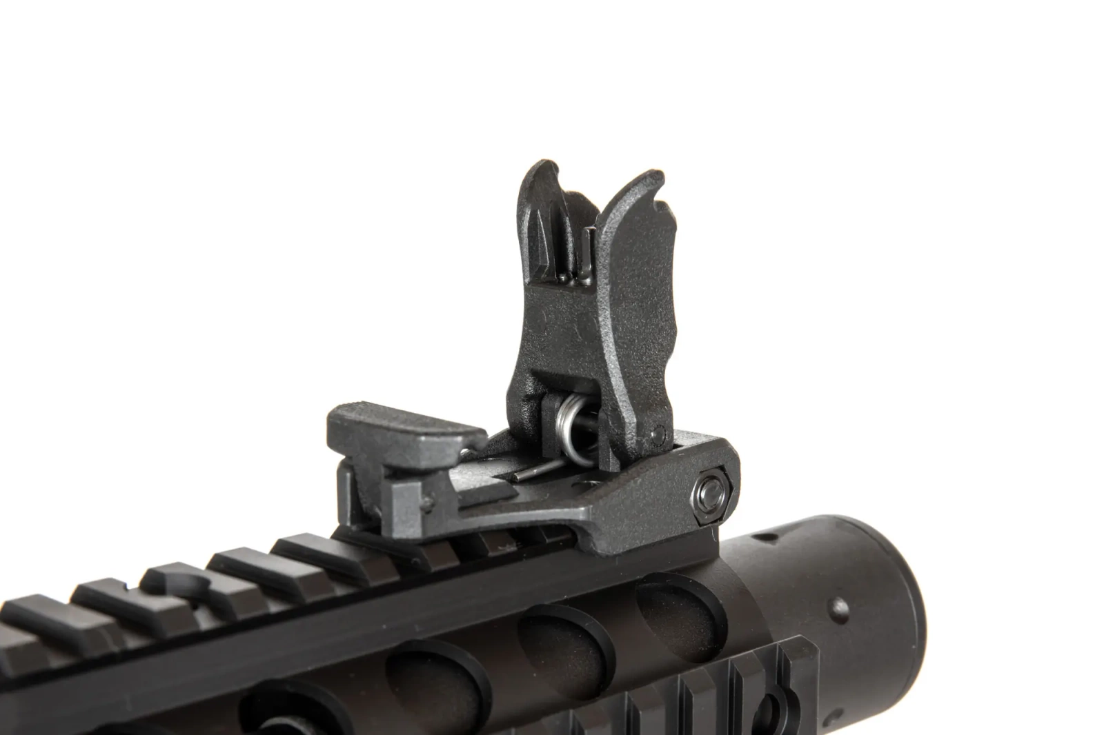 The SA-E05 airsoft rifle is equipped with a front in standard RIS 22mm allowing mounting of various accessories - grips, torches, laser pointers or optical sights. The replica's barrel is terminated with an exhaust device mounted on a 14mm CCW thread. On the dorsal RIS rail are placed folding sighting instruments.