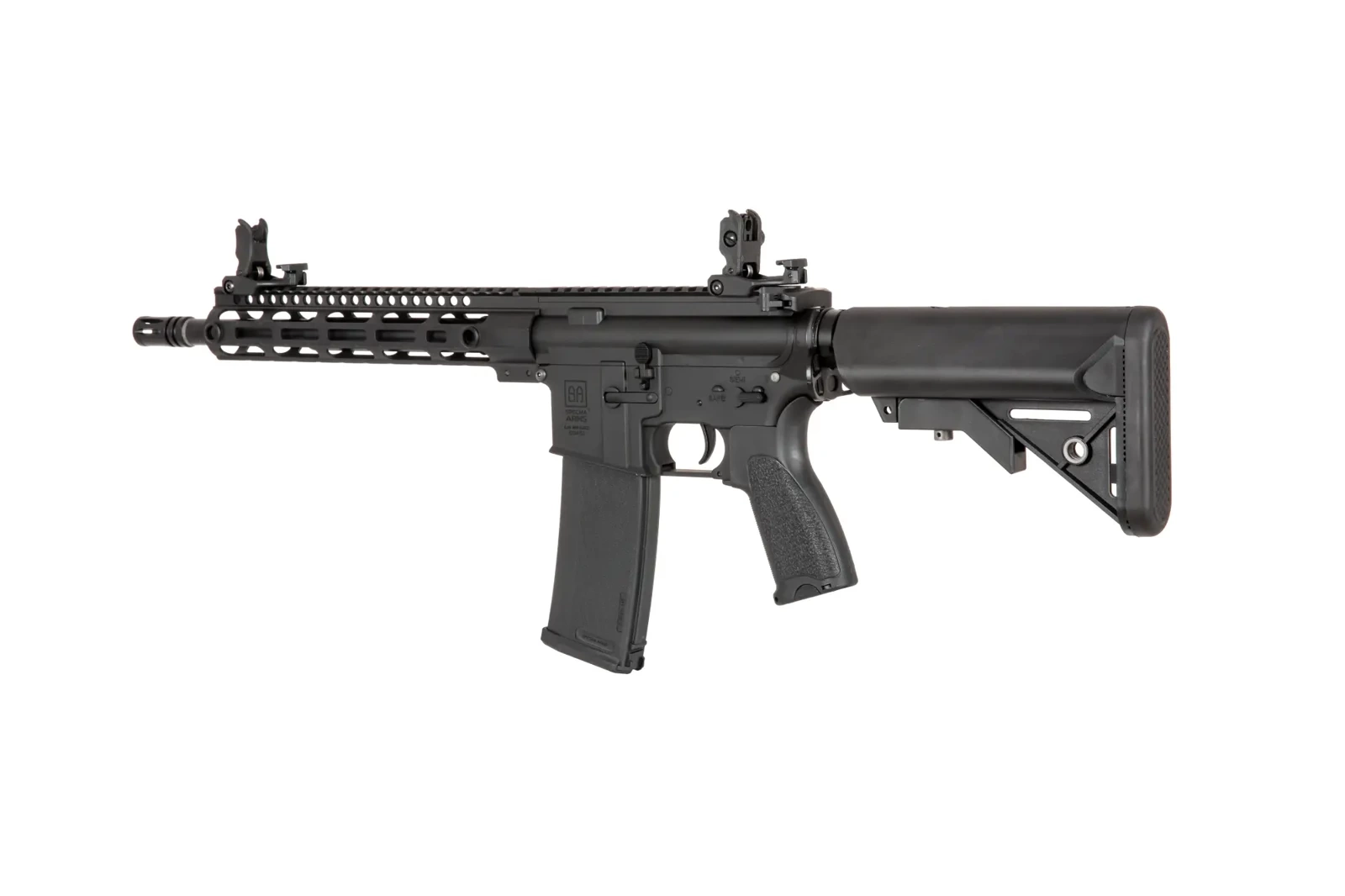 The SA-E20 airsoft rifle is fitted with a front rail in the MLOK/RIS 22mm mounting system. The barrel terminates in a standard exhaust device seated on a 14mm CCW thread. On the back of the replica are placed folding sighting instruments.
