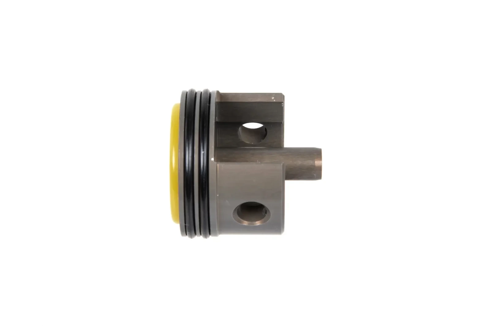 Double sealed cylinder head made from high quality aluminium EN AW 7075-T6 with H+PTFE coating. Precision machining on CNC machines guarantees a perfect fit with the cylinder. Improves air leakage and quality of the shot. Used in power tuning.