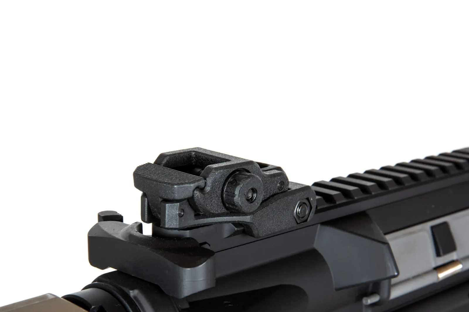 The SA-E20 carbine replica is fitted with a front rail in the MLOK/RIS 22mm mounting system. The barrel is finished with a standard exhaust device mounted on a 14mm CCW thread. On the back of the replica are placed folding targeting instruments.