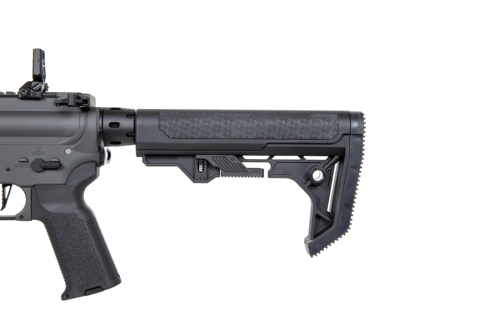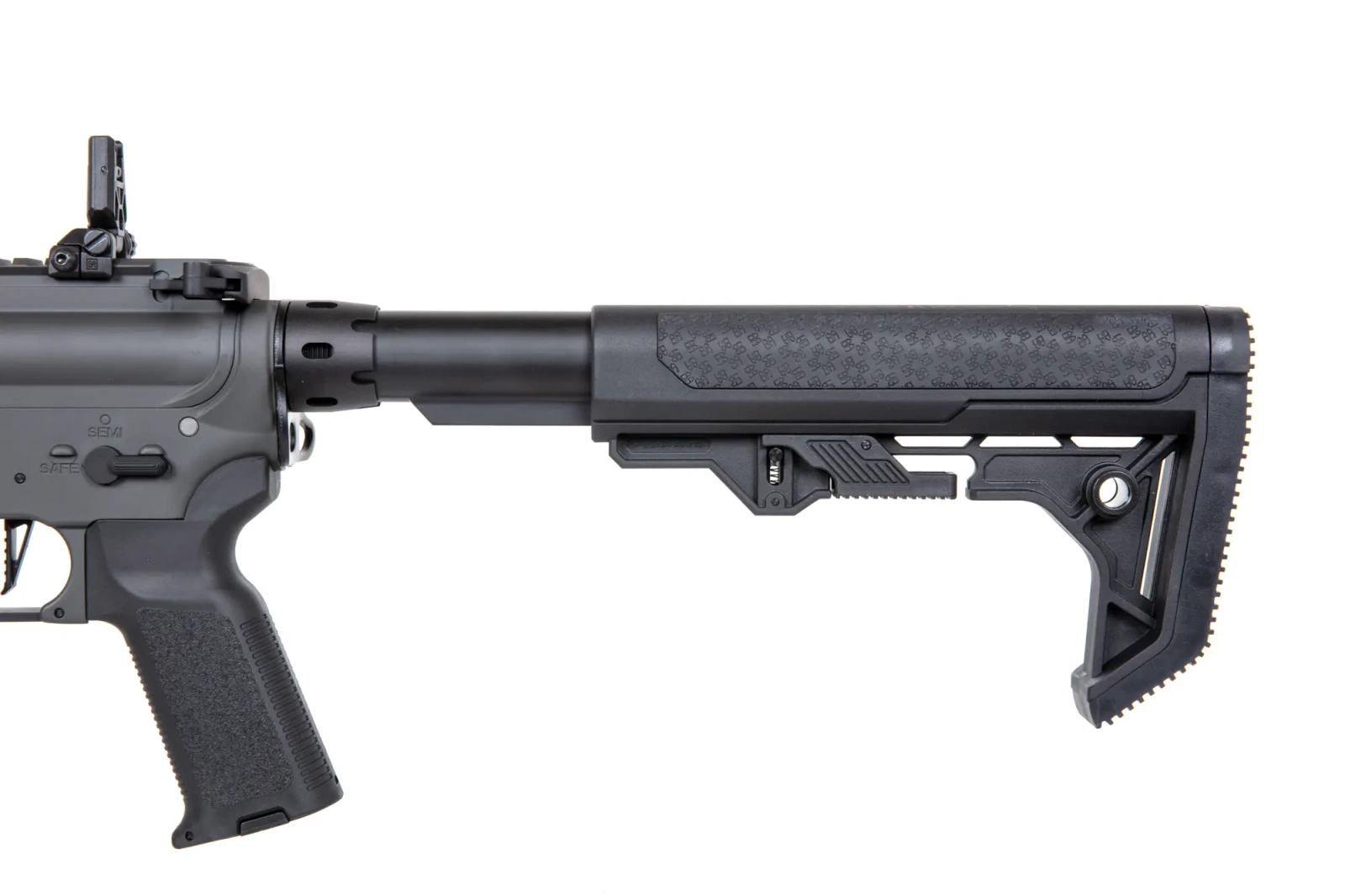 The SA-E08 airsoft rifle is equipped with a front rail in theMLOK mounting system, on which various tactical accessories can be mounted: torches, grips, laser pointers or optical sights. On the long, dorsal rail there are folding sighting instruments. The replica's barrel, on the other hand, is finished with a standard discharge device mounted on a 14mm CCW thread.