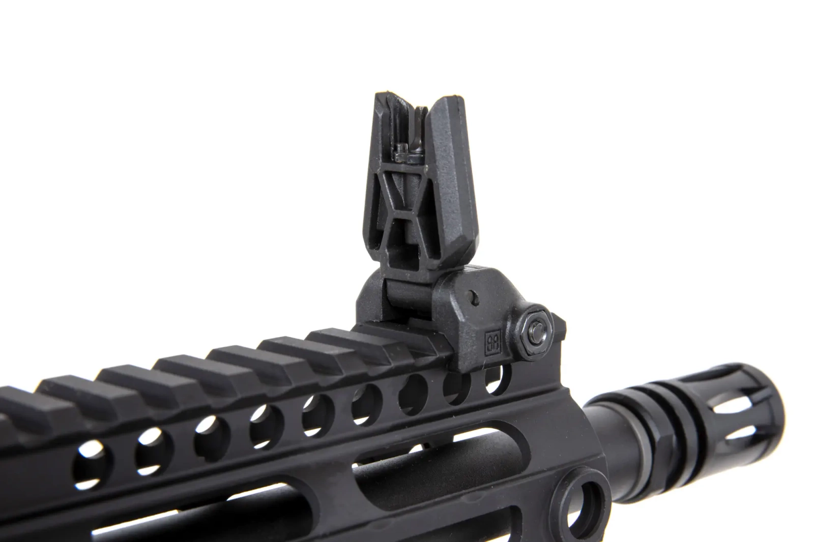 The replica is equipped with a free-float front in the M-LOK mounting system, on which various tactical accessories can be mounted: torches, grips, laser pointers or optical sights. The replica is also equipped with folding sighting devices on the back.